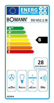 Bomann DU 652.1 IX. Maximale Absaugleistung: 338,6 m³/h, Absaugart: Abluft/Umluft, Flüssige, dynamische Effizienz-Klasse: D. Typ: Wandmontiert, Produktfarbe: Edelstahl, Lampenleistung: 2 W. Fettfiltertyp: Aluminium, Anzahl Filter: 2 Stück(e), Anzahl der Filterschichten: 5 Stück(e). Energie-Effizienzklasse: B, Jährlicher Energieverbrauch: 28 kWh, Anschlusswert: 67 W. Breite: 600 mm, Tiefe: 500 mm, Höhe (min): 58 cm