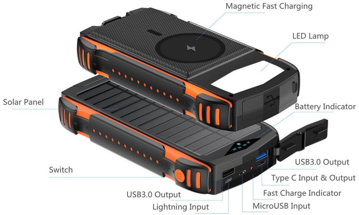 Powerbank mit 7 Anschlüssen und Solarpanel und einer Kapazität von 20000 mAh