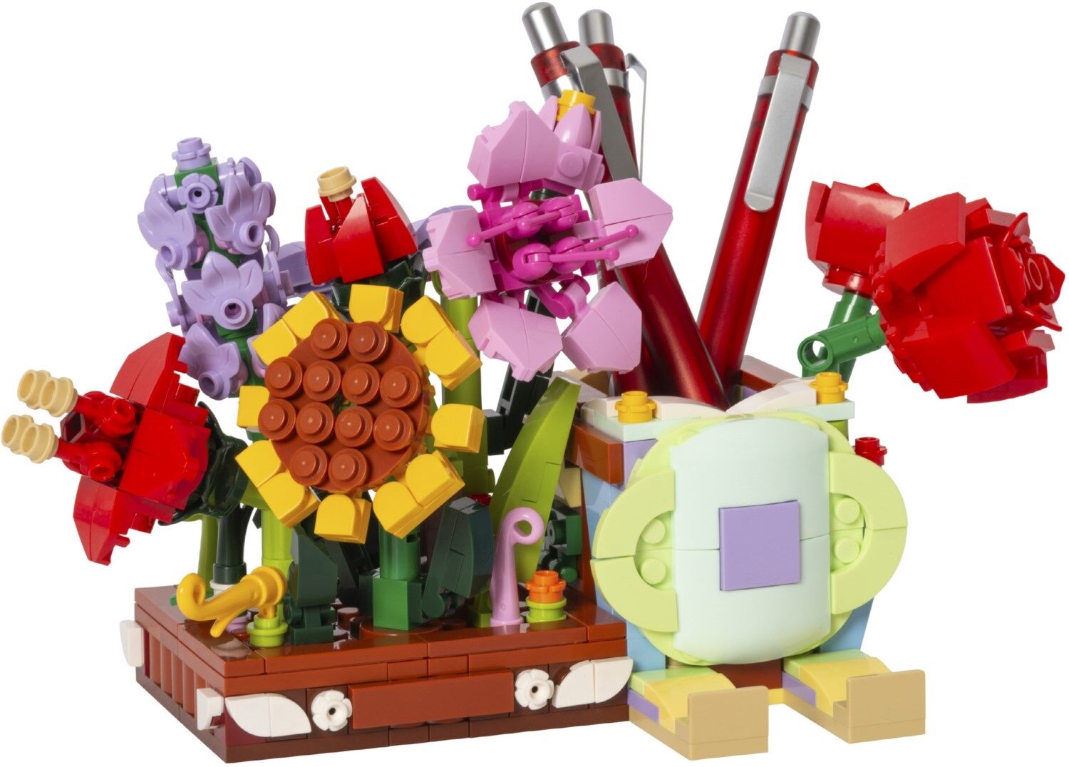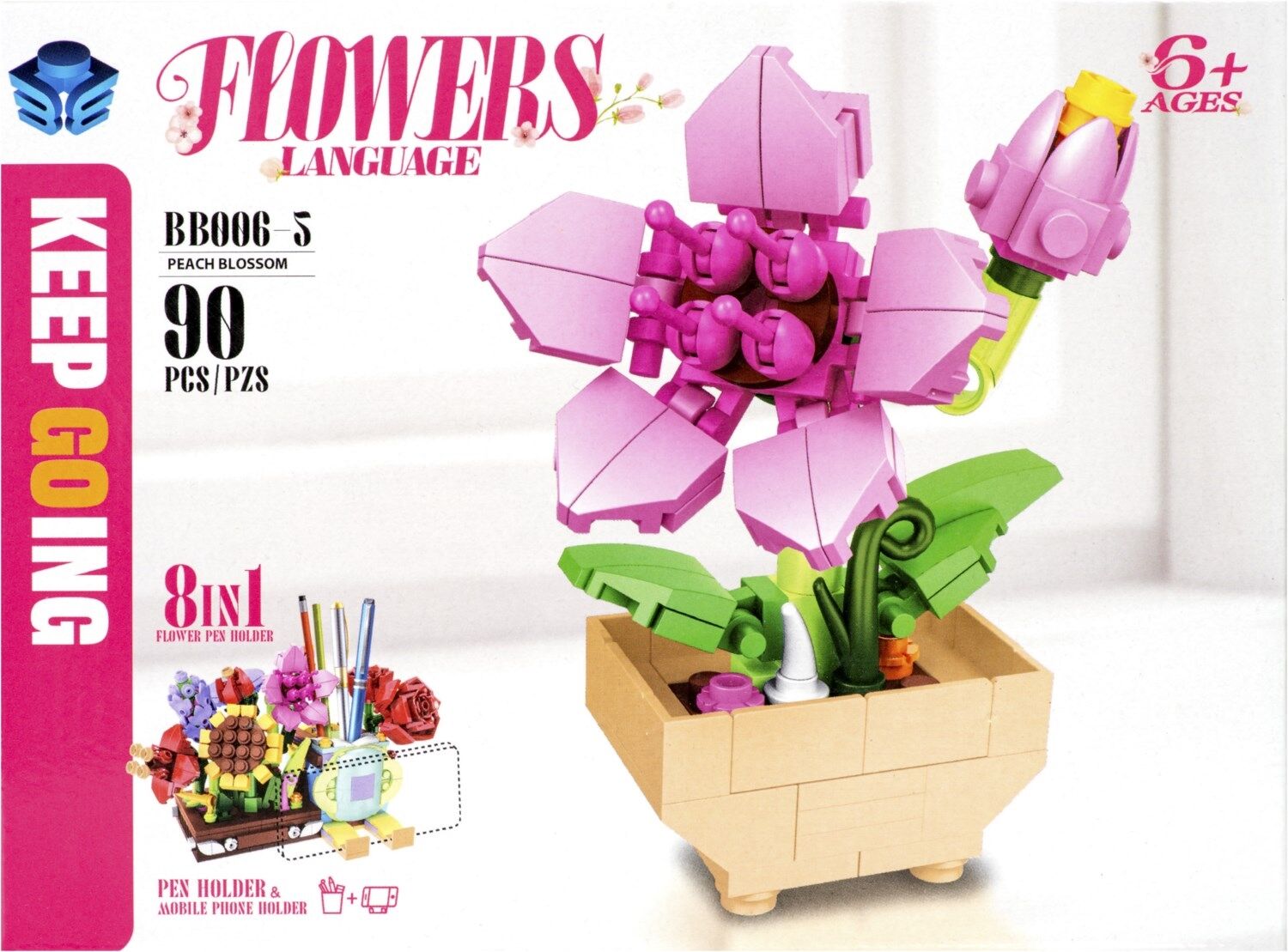 Acht verschiedene Einzelpackungen, jede mit einem liebevoll gestalteten Blumenelement, die zusammen eine praktische und dekorative Halterung für Stifte und ein Smartphone bilden