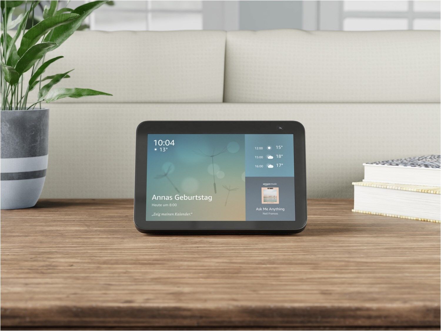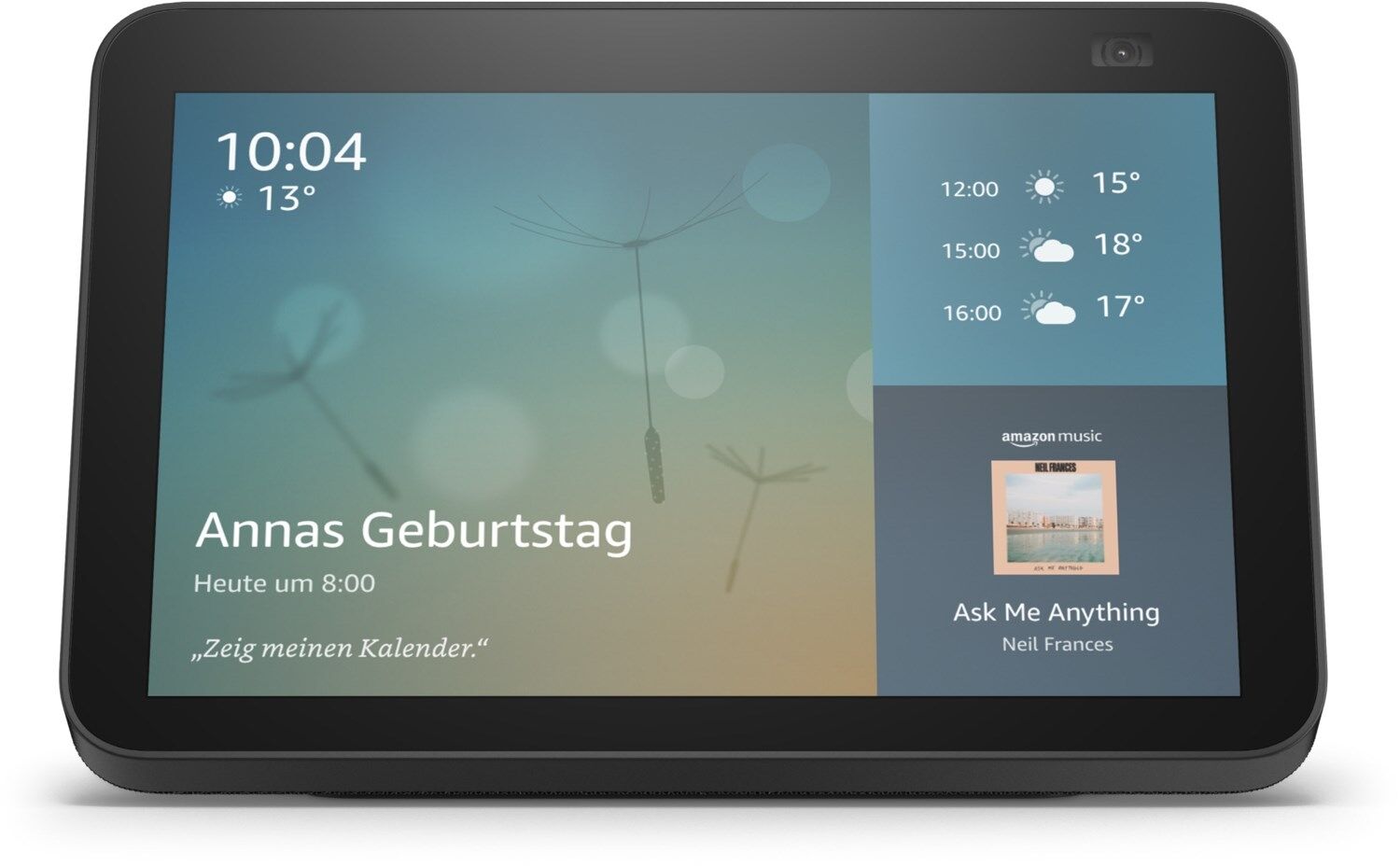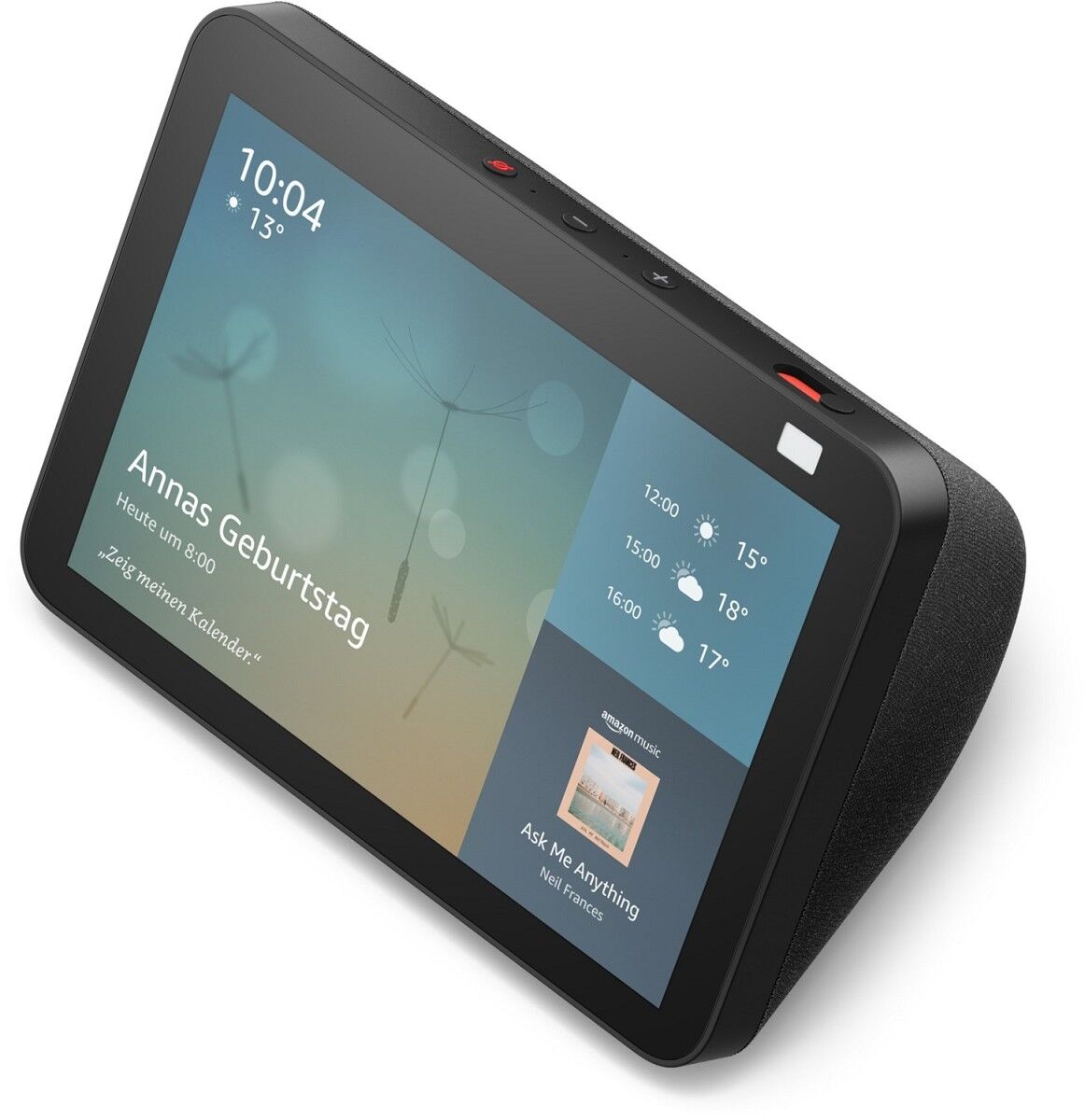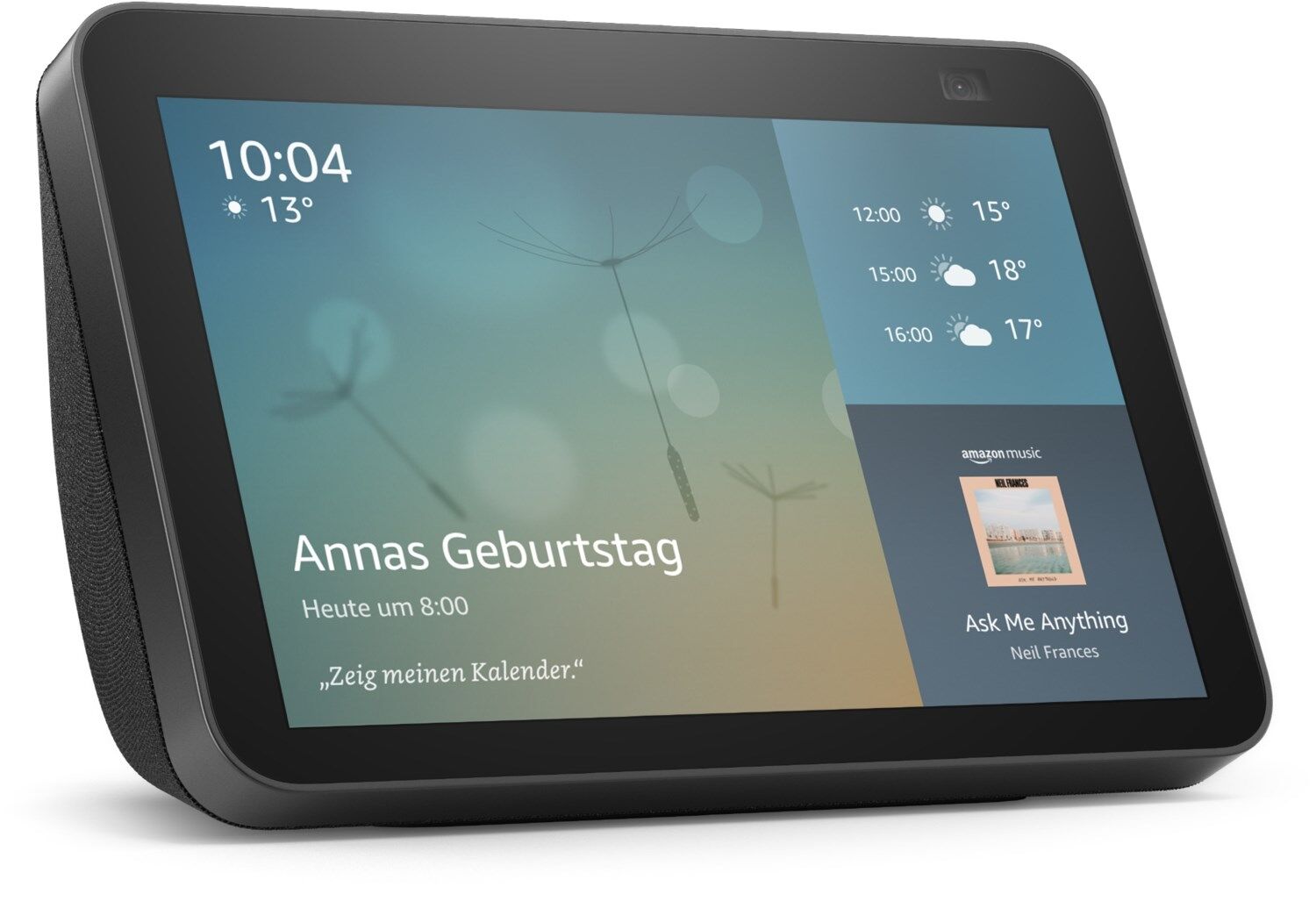 Alexa zeigt viele Dinge: Mit 8-Zoll-HD-Touchscreen, adaptiver Farbanpassung und Stereolautsprechern wird Unterhaltung zum Leben erweckt. Bei Videoanrufen mit der 13-MP-Kamera bleiben Sie dank automatischer Bildanpassung immer im Mittelpunkt.