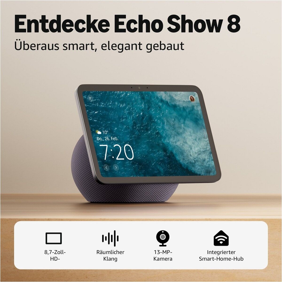 Leistungsstark, smart und elegant gebaut. Das neu gestaltete 8,7-Zoll-Smart-Display verfügt über einen brillanten HD-Touchscreen, einen integrierten Smart-Home-Hub, einen AZ3 Pro-Chip für starke Leistung und Omnisense-Technologie für ein verbessertes Umgebungserlebnis.