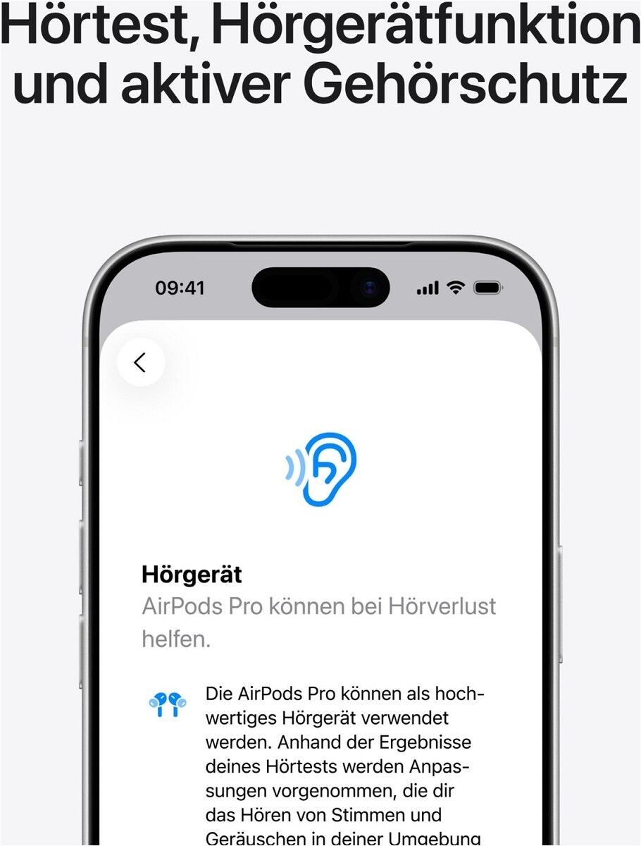 ⁴ Unterstützt auf den AirPods Pro 2 und neuer mit der neuesten Firmware, wenn sie mit einem kompatiblen iPhone oder iPad mit dem neuesten Betriebssystem gekoppelt sind. Die Hörgerät- und Gehörschutzfunktionen werden auch auf Mac mit der neuesten Software unterstützt. Weitere Infos zur vollständigen Dämmung und zum Gehörschutzfeature gibt es unter support.apple.com/de-de/120850.
