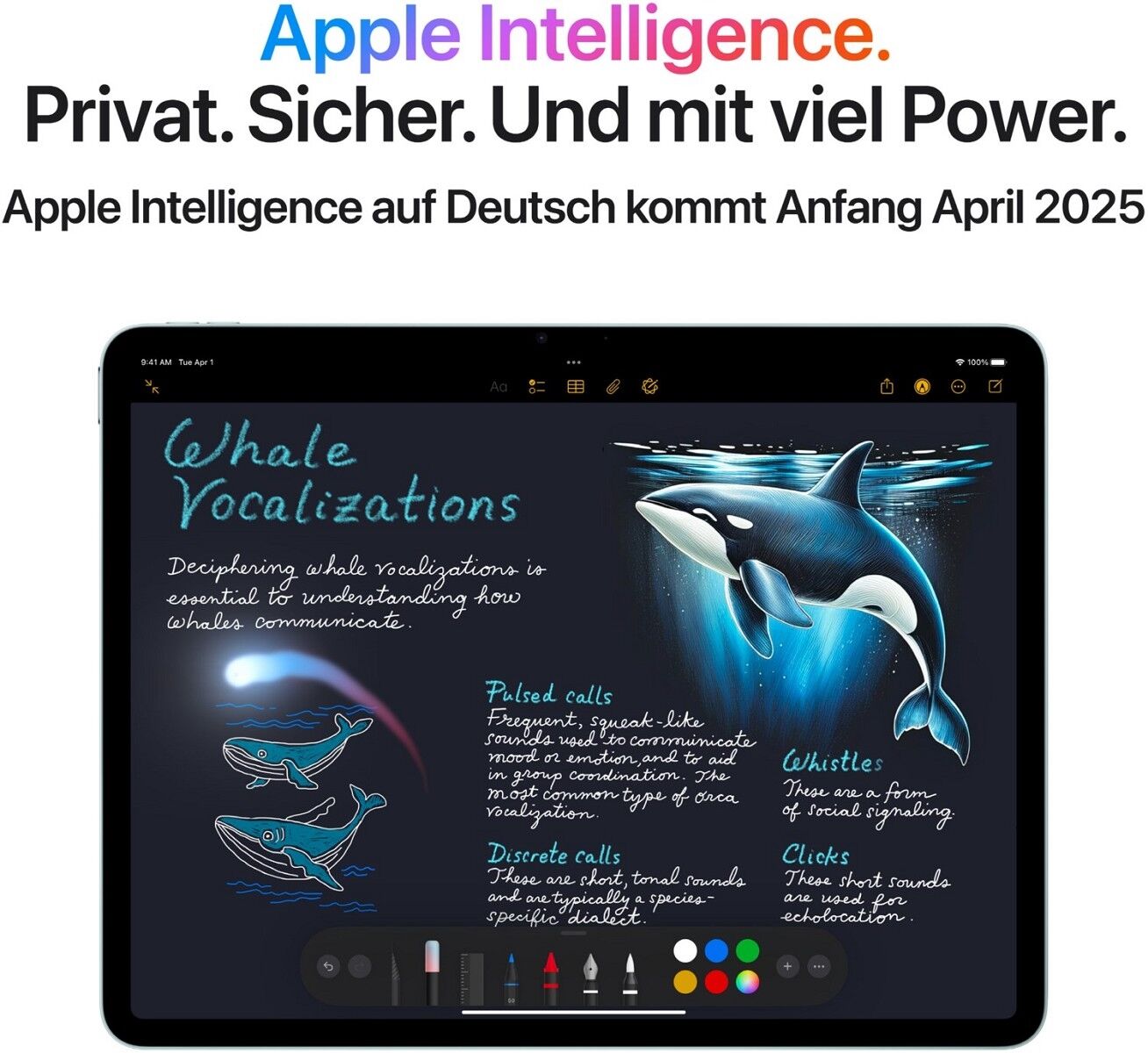 ² Apple Intelligence ist in der Betaversion als iPadOS 18 Update auf dem iPad mini (A17 Pro) und iPad Modellen mit M1 und neuer verfügbar, wenn Siri und die Gerätesprache auf Englisch (Australien, Kanada, Irland, Neuseeland, Südafrika, Großbritannien oder USA) eingestellt sind. Zusätzliche Features und Sprachen, einschließlich Deutsch, werden Anfang April 2025 verfügbar sein. Einige Features sind u. U. nicht in allen Regionen oder Sprachen verfügbar.