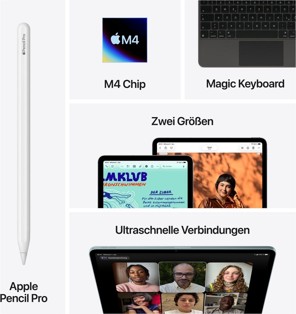 Das 11" iPad Air. Entwickelt für Apple Intelligence.¹ Das iPad Air kommt jetzt mit der Power des Apple M4 Chip. Unglaublich leistungsstark und günstig. Es hat ein beeindruckendes Liquid Retina Display, eine 12 MP Center Stage Frontkamera für großartige Videoanrufe, iPadOS und superschnelles WLAN 7² und 5G.³ Und es ist mit dem Apple Pencil Pro, dem Magic Keyboard für das iPad Air und mehr kompatibel. So kannst du ganz einfach mehrere Aufgaben gleichzeitig erledigen, lernen, arbeiten, spielen und kreativ sein.