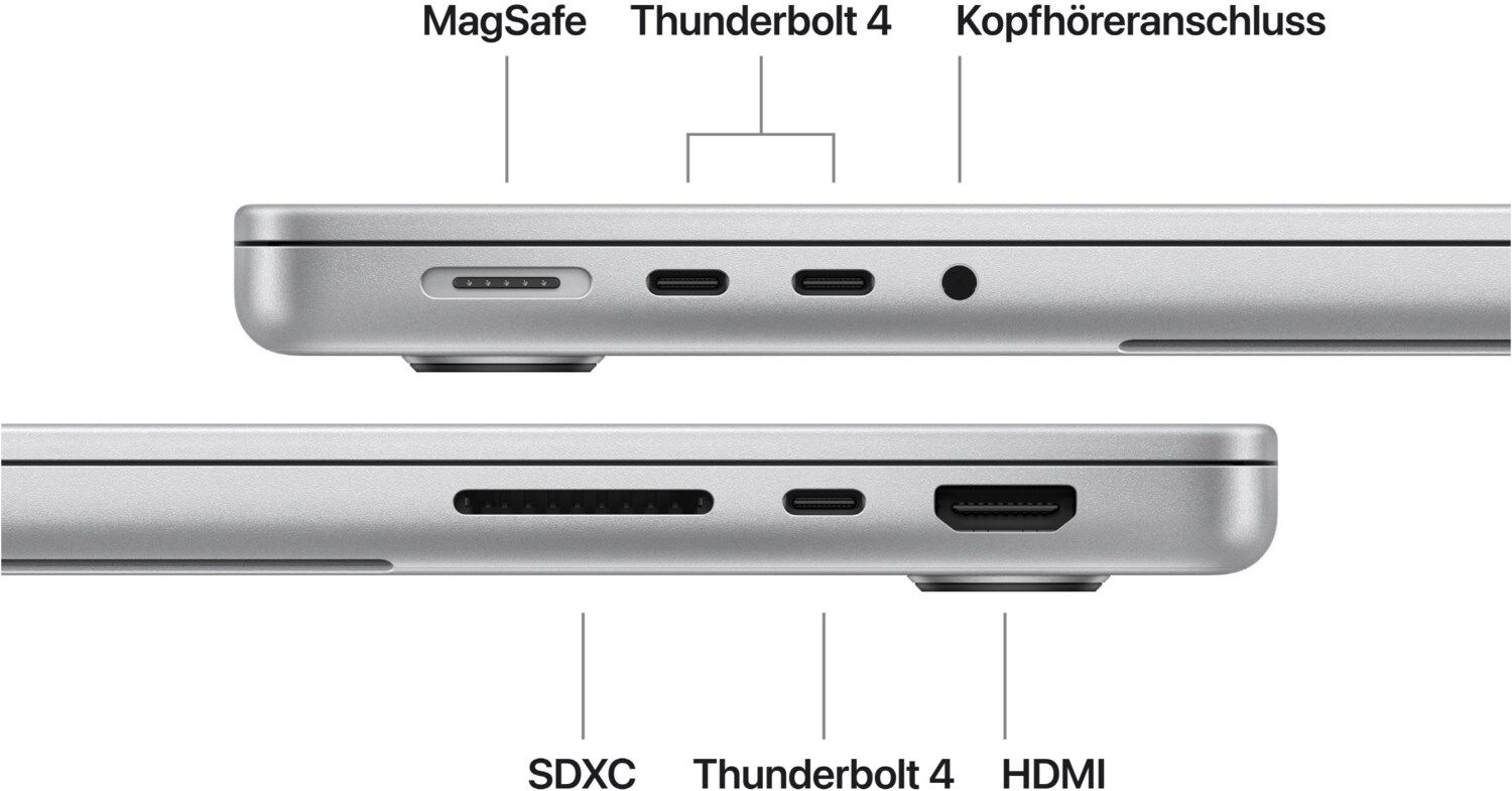 VERBINDE ALLES - Dieses MacBook Pro hat drei Thunderbolt 4 Anschlüsse und einen MagSafe 3 Ladeanschluss, einen SDXC Kartensteckplatz, einen HDMI Anschluss und einen Kopfhöreranschluss. Und es unterstützt bis zu zwei externe Displays