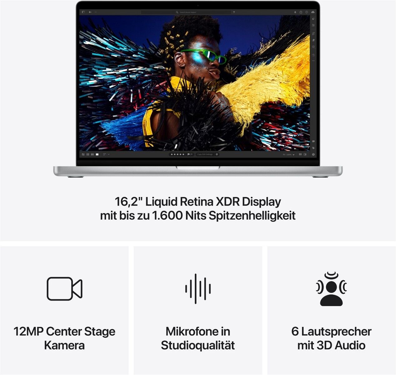 BRILLANTES PRO DISPLAY - Das 16,2" Liquid Retina XDR Display4 hat 1.600 Nits Spitzenhelligkeit, bis zu 1.000 Nits durchgehende Helligkeit und ein Kontrastverhältnis von 1.000.000:1