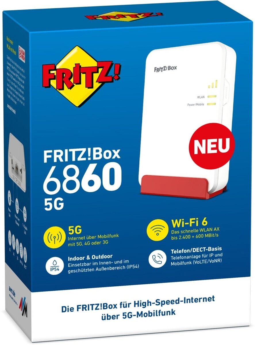 Die FRITZ!Box 6860 5G bringt ultraschnelles 5G-Mobilfunk-Internet mit bis zu 1,3 GBit/s ins kabellose Heimnetz. Als Fixed-Wireless-Access-Lösung unterstützt sie sowohl 5G (NSA, SA) als auch LTE. Mit leistungsstarkem WLAN Mesh mit Wi-Fi 6 verteilt sie die Daten mit bis zu 3 GBit/s drahtlos im ganzen Haus. Dank des kompakten Designs und der Strom- und Datenversorgung über Power over Ethernet kann die vielseitige FRITZ!Box 6860 5G sowohl im Innen- als auch im Außenbereich genutzt werden. Eine DECT-Basisstation für Telefonie und Smart-Home-Anwendungen rundet das vielseitige Leistungsspektrum ab.