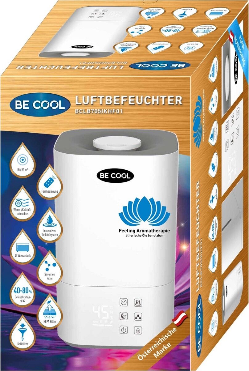 Die Aroma Funktion ist einfach zu aktivieren. Geben sie ein paar Tropfen Ihres Lieblings Öls in das Aroma Fach und aktivieren sie den Luftbefeuchter. Ein Raumduft hat enormen Einfluss auf Körper und Geist. Er kann den Organismus beleben, weckt schöne Erinnerungen oder regt zum kreativen Denken an. Darüber hinaus vermittelt er sowohl im Bad als auch im Schlaf- oder Wohnzimmer ein gemütliches Wohnklima und lädt zum Entspannen ein. Der kompakte Be Cool Befeuchter und Diffuser kann mit oder ohne Aromaöl verwendet werden