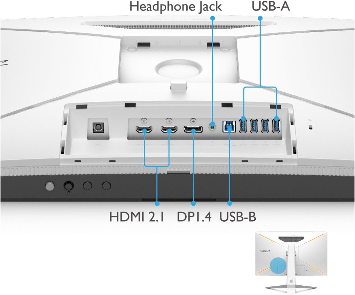 2x HDMI 2.1, 1x DisplayPort 1.4, 1x USB Type-B, (Upstream), 4x USB 3.0 (Downstream)