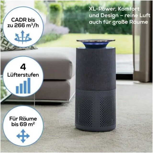 Luftreinigung durch ein dreischichtiges Filtersystem (Vorfilter + HEPA H13 Filter + Aktivkohle), für Räume bis ca. 69 m²