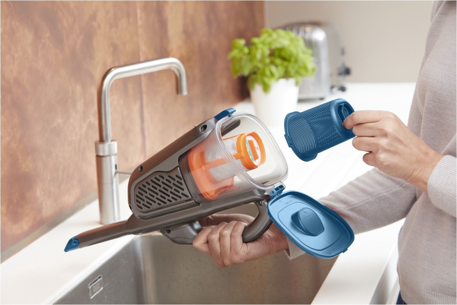Transparenter Bereich, um jederzeit zu erkennen, wie viel Schmutz im Behälter ist. Lässt sich auf Knopfdruck öffnen, ohne mit dem Schmutz in Berührung zu kommen