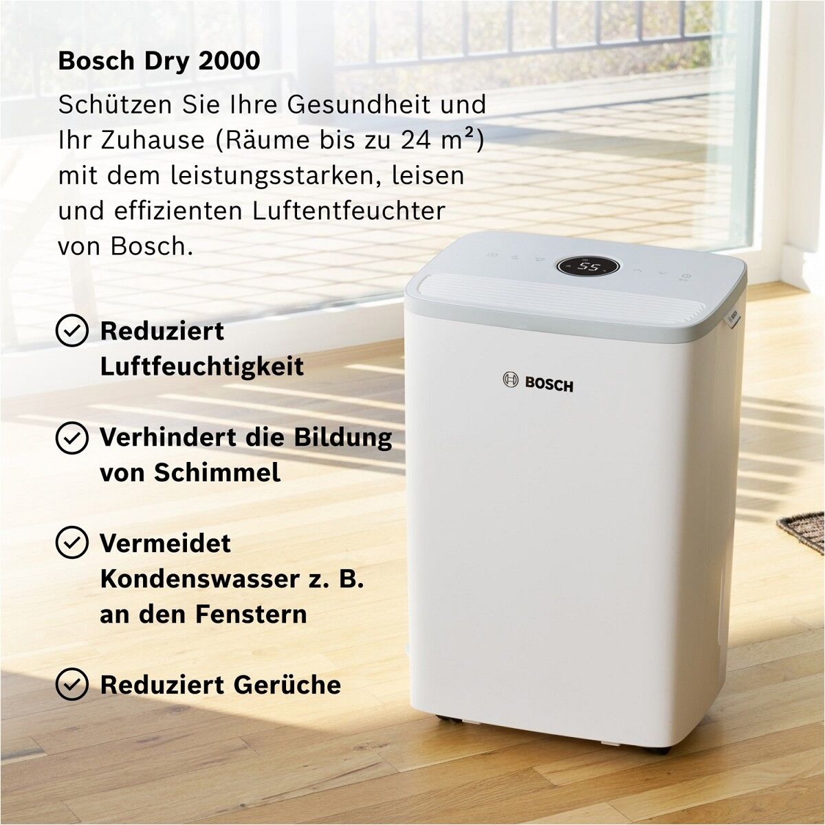 Die Luftentfeuchter der Dry Serie von Bosch entfernen überschüssige Feuchtigkeit aus der Luft und sorgen dadurch für ein gesünderes und angenehmeres Raumklima. Der spezielle Wäschetrocknungsmodus sorgt für eine schonende und effiziente Trocknung Ihrer Wäsche.