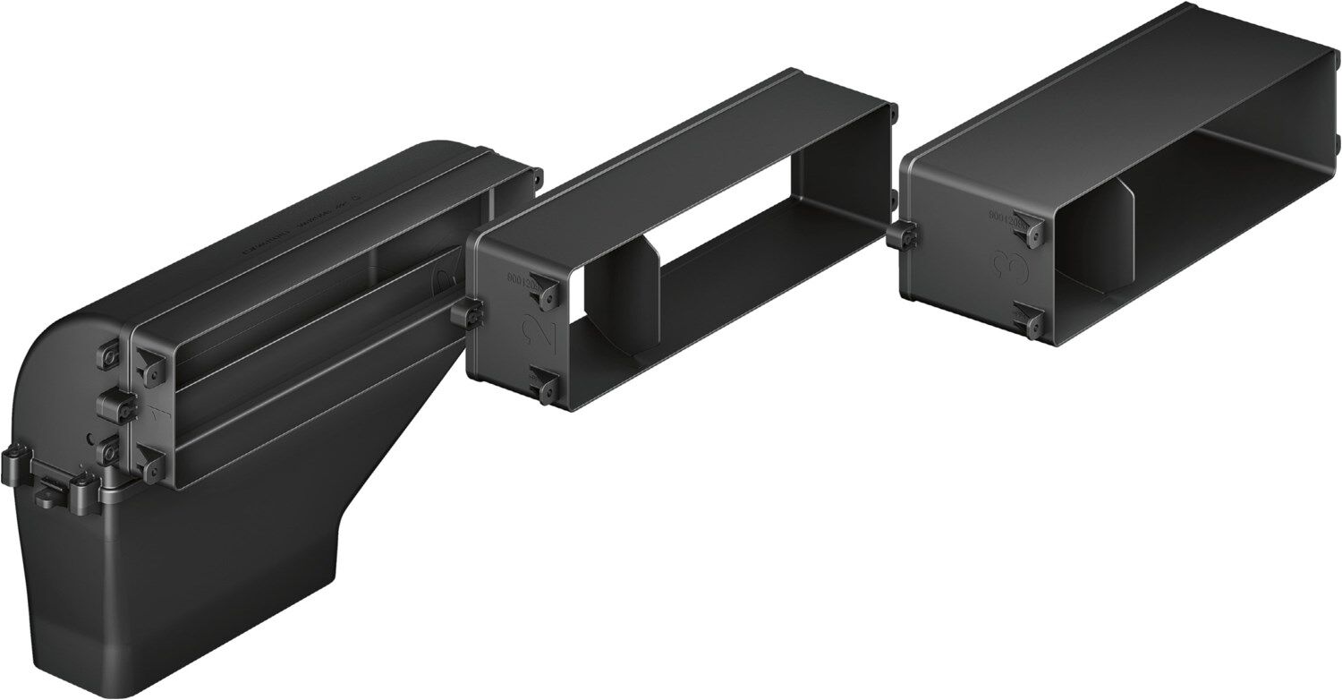 Bestehend aus: 3 zusammensteckbare Tiefenadapter (40mm, 80mm, 120mm) für Arbeitsplattentiefen von 600 - 750mm, 90° Umlenkstück, Verbindungsstück für weitergehende Verrohrungen mit 220x90mm Flachkanäle.