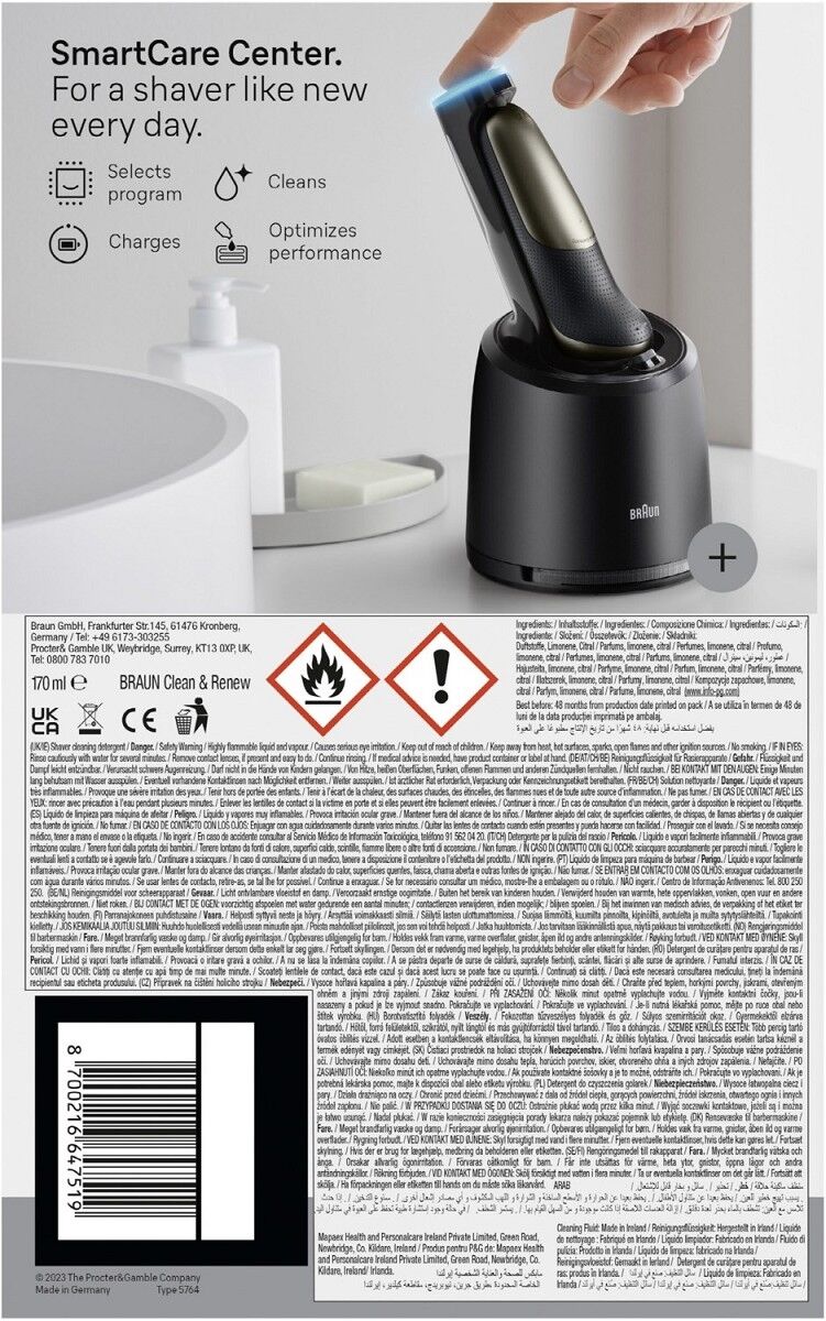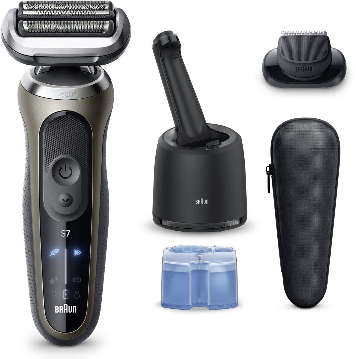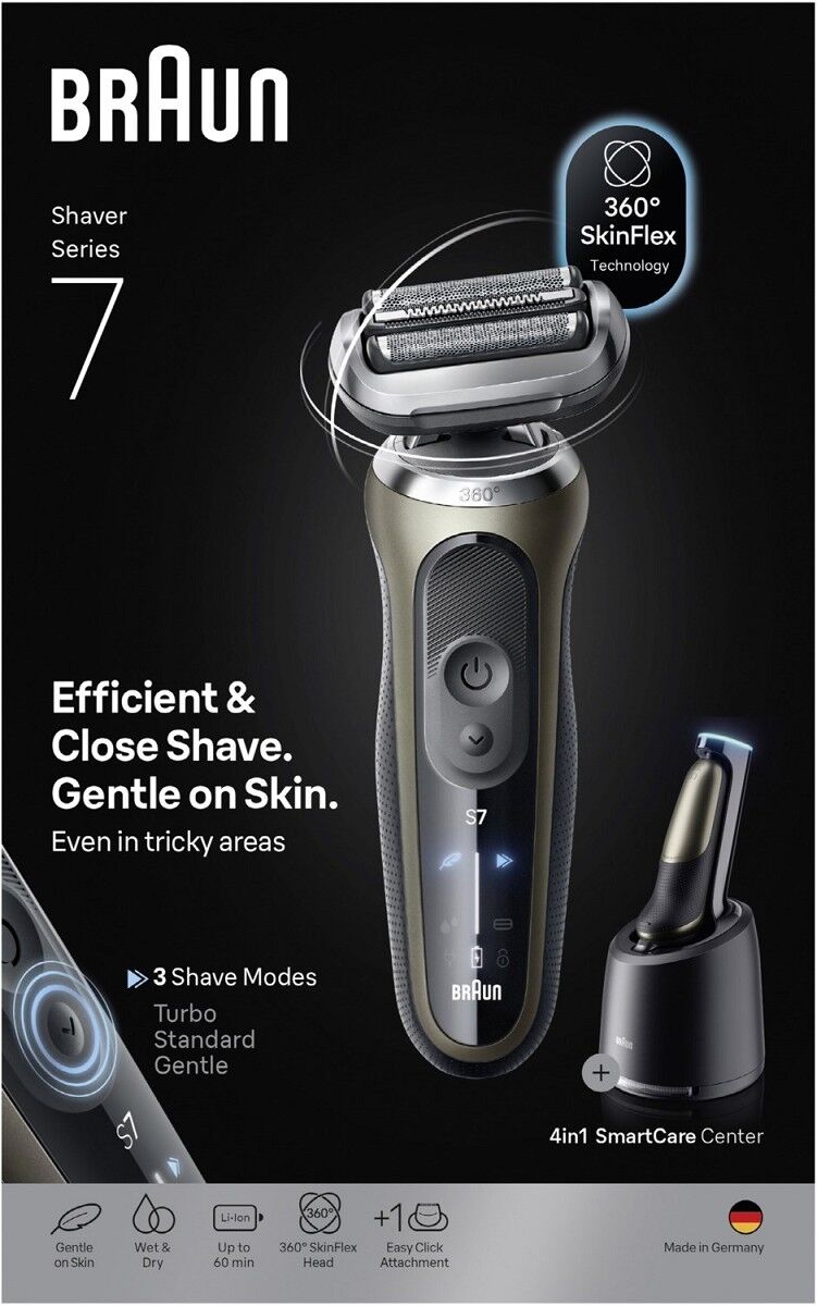 Der Braun Series 7 Elektrorasierer bietet eine gründlichere und schnellere Rasur als je zuvor (im Vergleich zur vorherigen Series 7). Der 360° SkinFlex Kopf passt sich deinen Konturen an für eine ultra glatte Rasur. Die 3 Rasiermodi: Turbo Modus, Sanfter Modus und Standard Modus, ermöglichen es, die Rasur auf deine Bedürfnisse abzustimmen. Das 4in1 SmartCare Center sorgt für eine optimale Reinigung und Wartung des Elektrorasierers. Der Li-Ion Akku bietet eine kabellose Laufzeit von bis zu 60 Minuten und eine 5-minütige Schnellladung. Der Series 7 Elektrorasierer für Männer ist 100% wasserdicht. Hergestellt in Deutschland. Lieferumfang: 1x Series 7 Rasierer, 1x Reiseetui, 1x Ladegerät, 1x Reinigungsbürste, 1x 4in1 SmartCare Center, 1x Reinigungskartusche, 1x Präzisionstrimmer-Aufsatz.