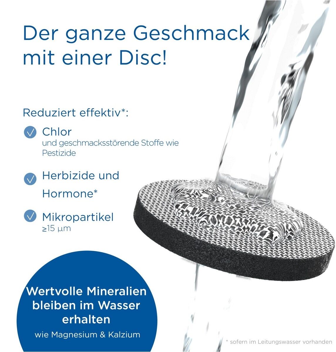 Eine Disc reicht für 4 Wochen oder für bis zu 60 Liter in Filterflaschen und für bis zu 150 Liter in Wasserfilterkaraffen