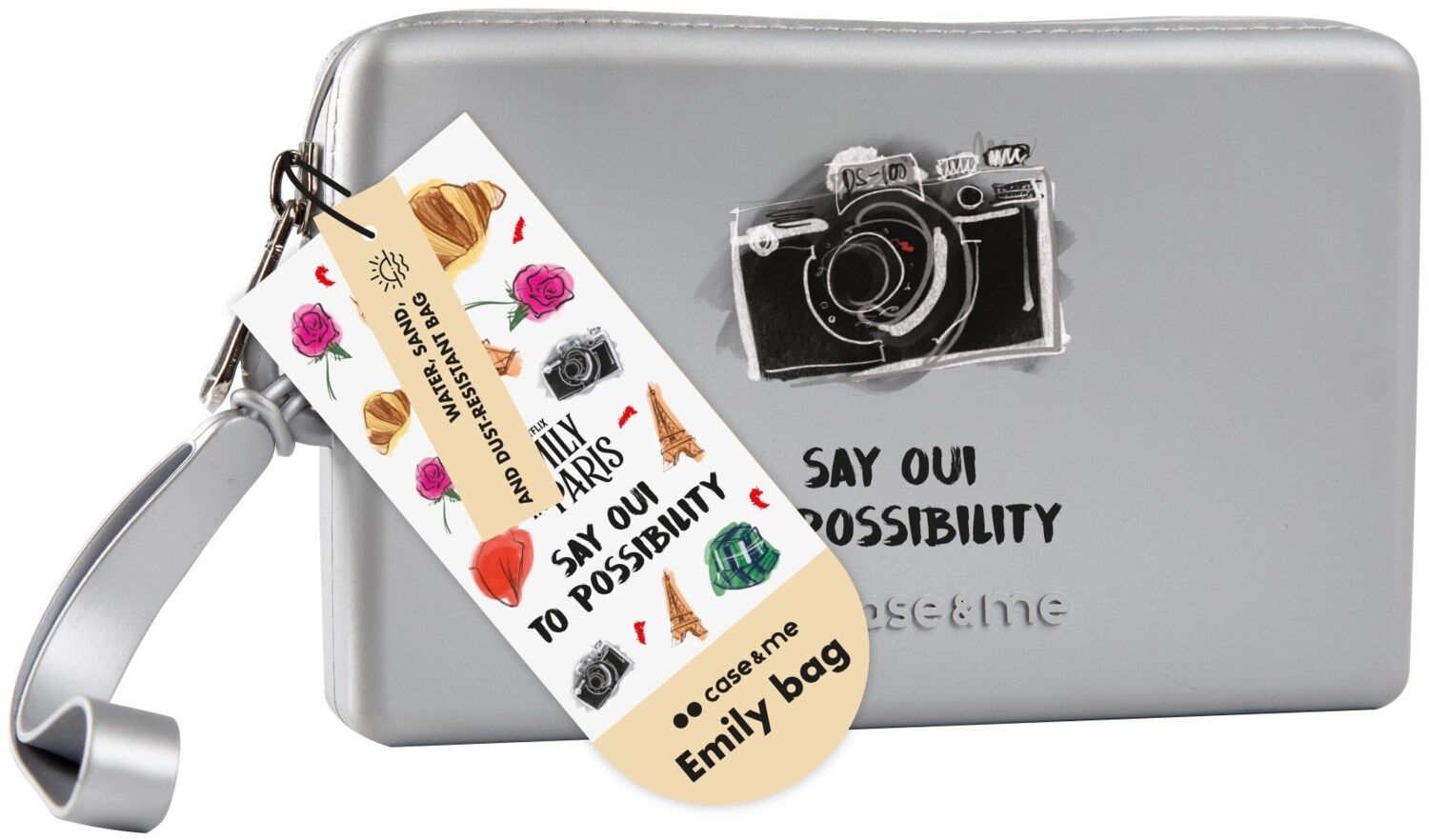 Eine einzigartige und raffinierte Handgelenktasche. Das Material ist Silikon, wodurch es sich weich und angenehm anfühlt. Es zeigt das Bild einer alten Kamera, das an Emilys ikonisches Smartphone-Gehäuse erinnert. Der Schriftzug „Say oui to possibility“ und der Anhänger „Emily in Paris“ machen es zu einem Must-Have für jeden Fan der Fernsehserie.