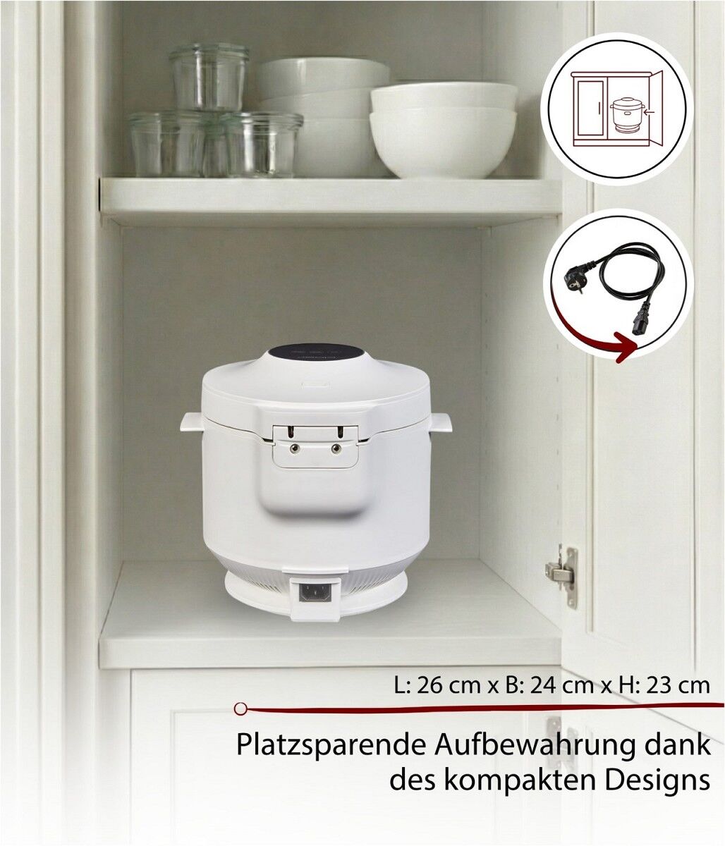 Die Warmhaltefunktion hält das Gericht nach dem Kochvorgang bereit, und dank spülmaschinengeeigneter Teile bleibt der Aufwand bei der Reinigung gering.