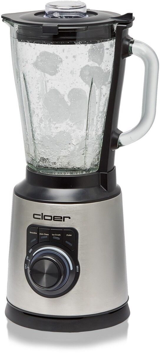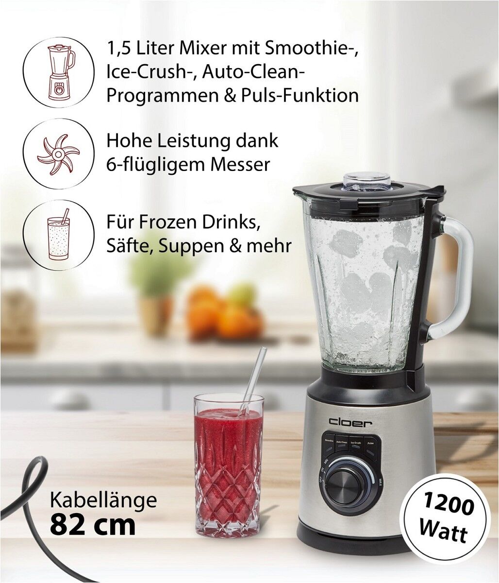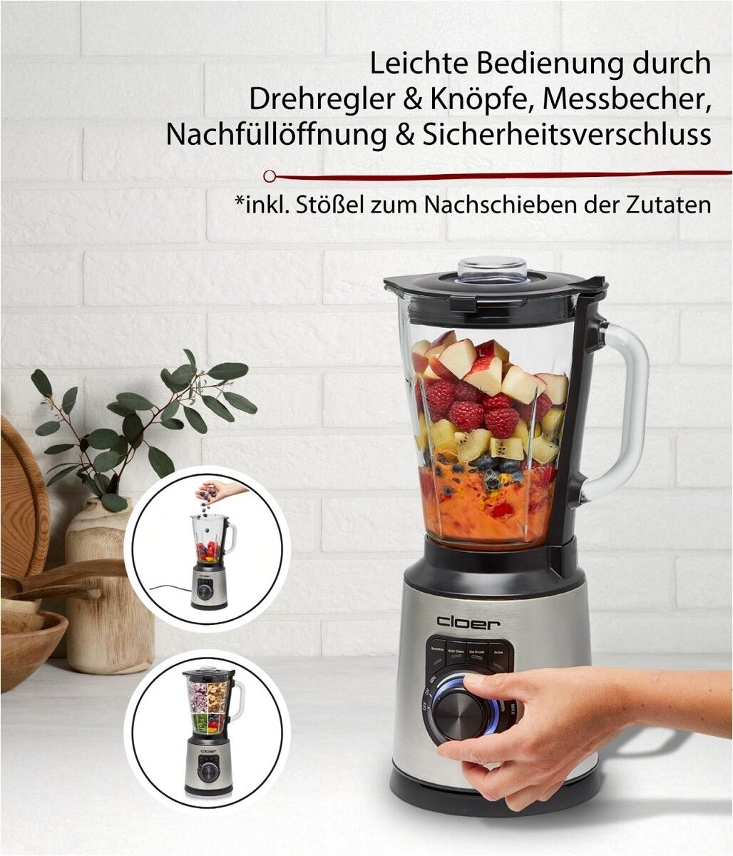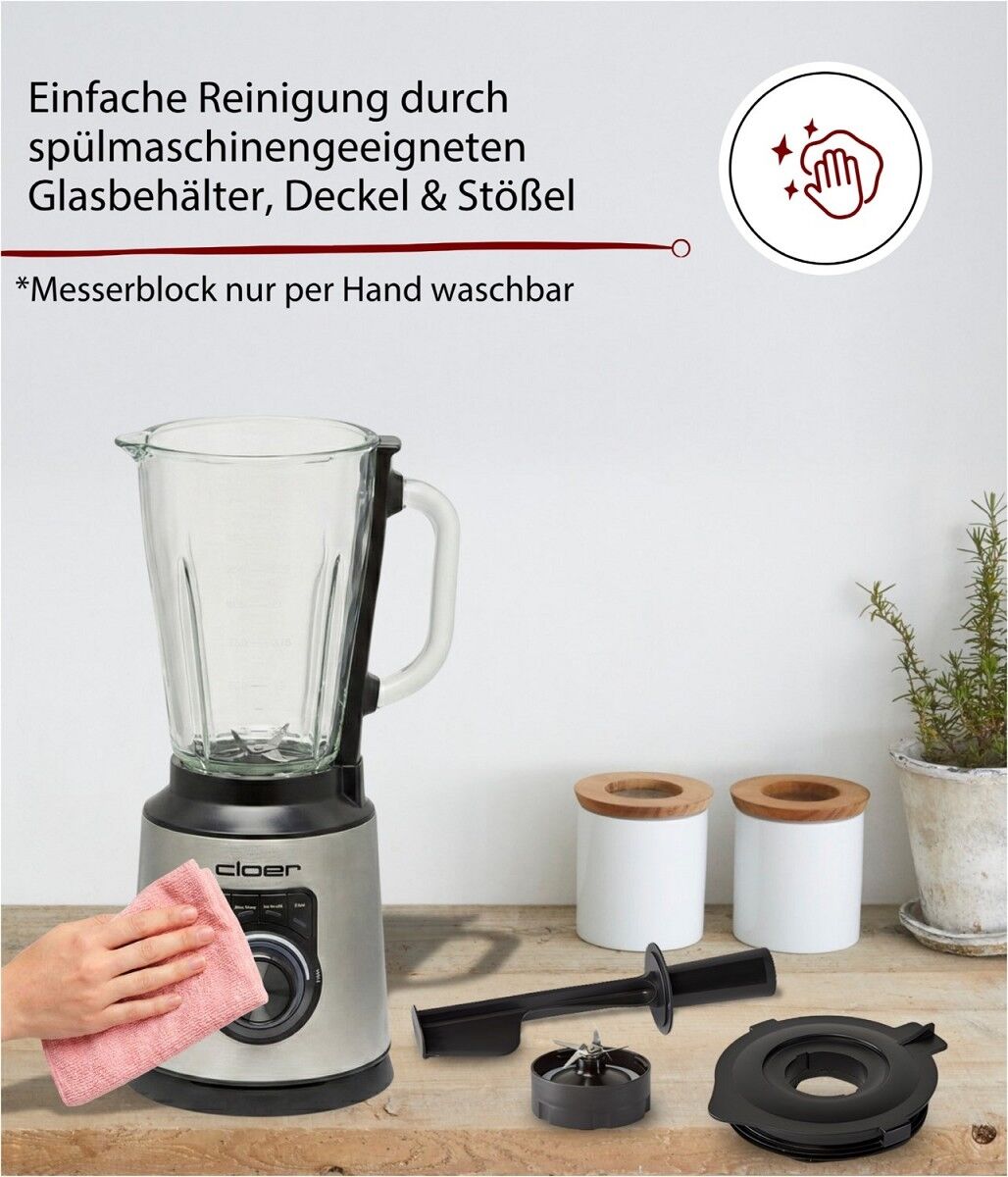 Der Cloer 6958 Standmixer verfügt über einen 1,5-Liter-Glasbehälter, ein entnehmbares Messer und vier automatische Programme für Smoothies, Reinigung, Ice Crush und Pulsbetrieb.