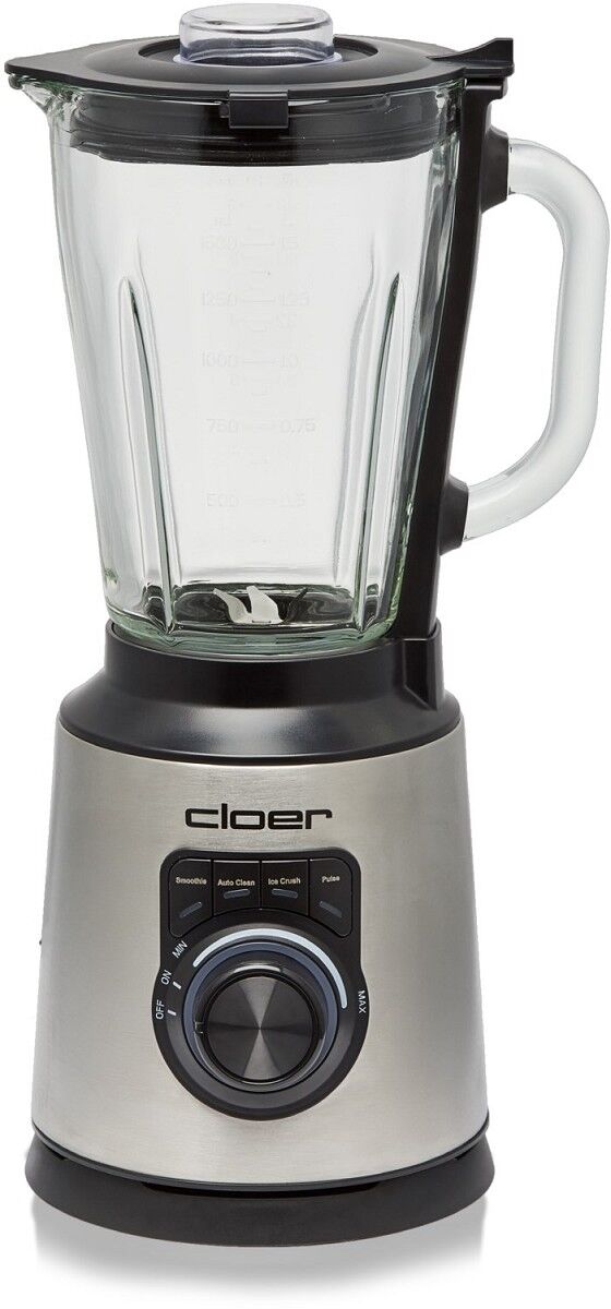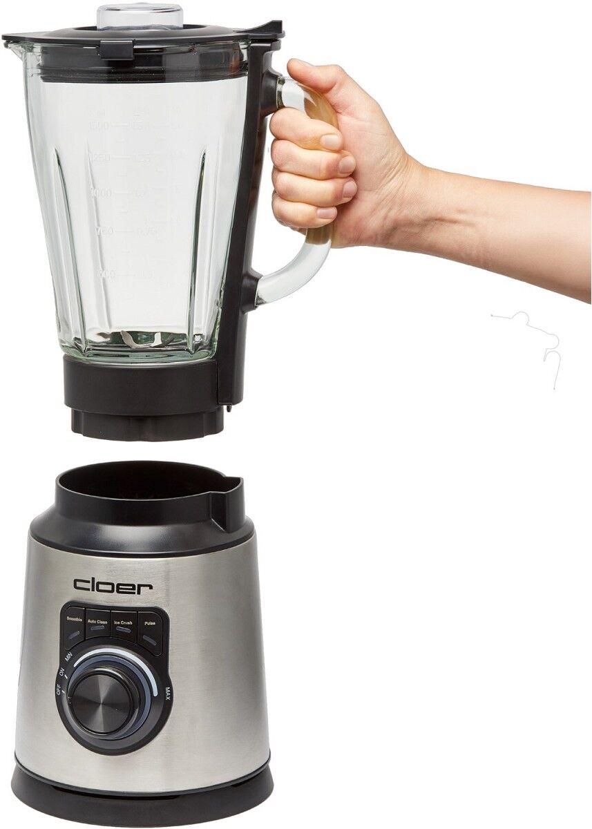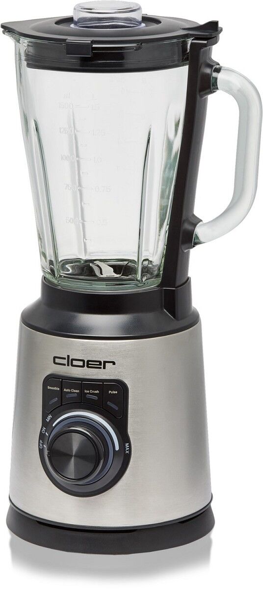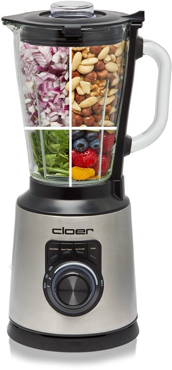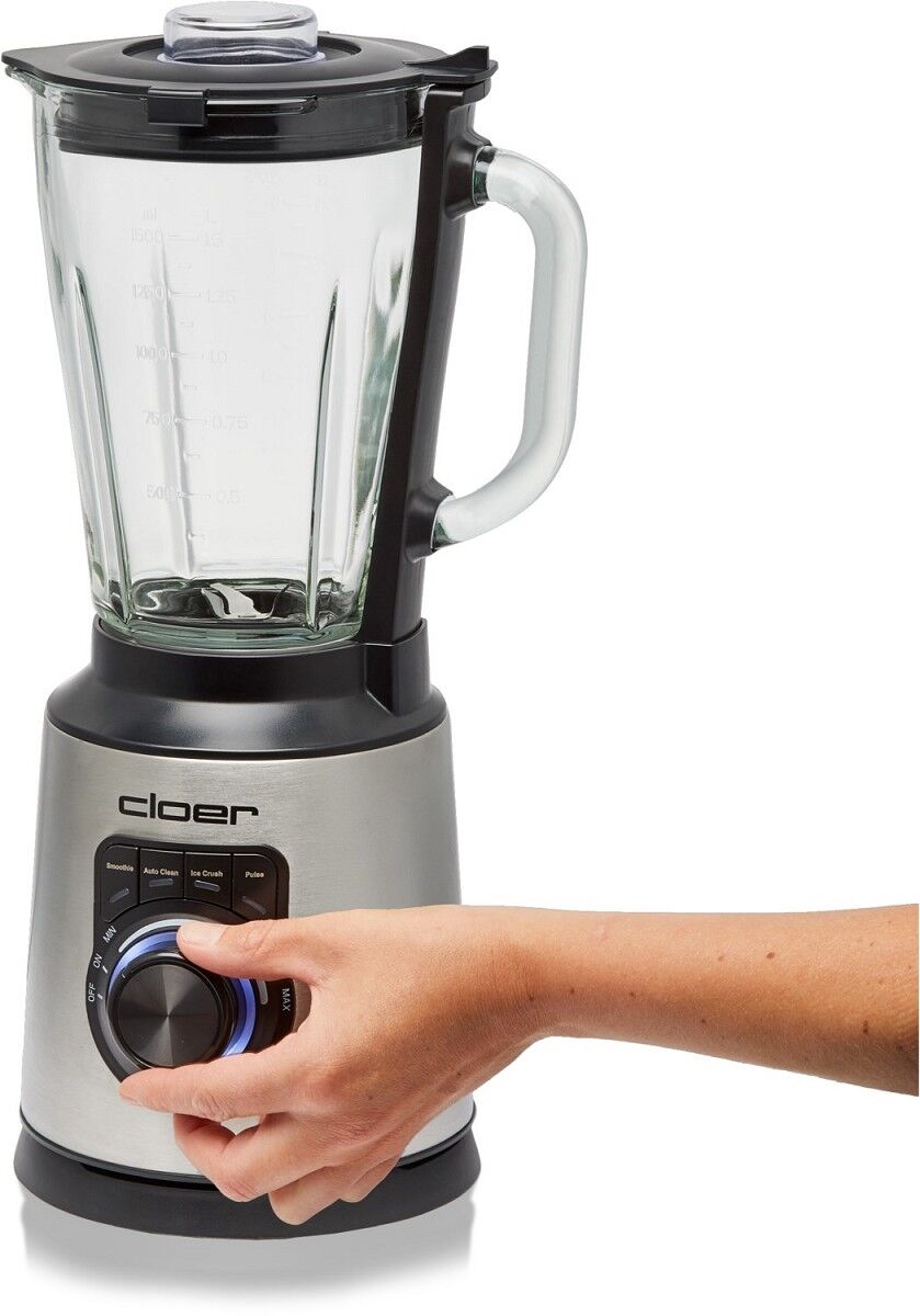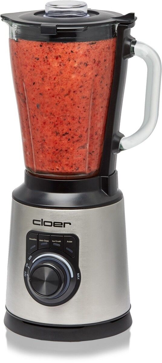 Der Cloer 6958 Standmixer verfügt über einen 1,5-Liter-Glasbehälter, ein entnehmbares Messer und vier automatische Programme für Smoothies, Reinigung, Ice Crush und Pulsbetrieb.