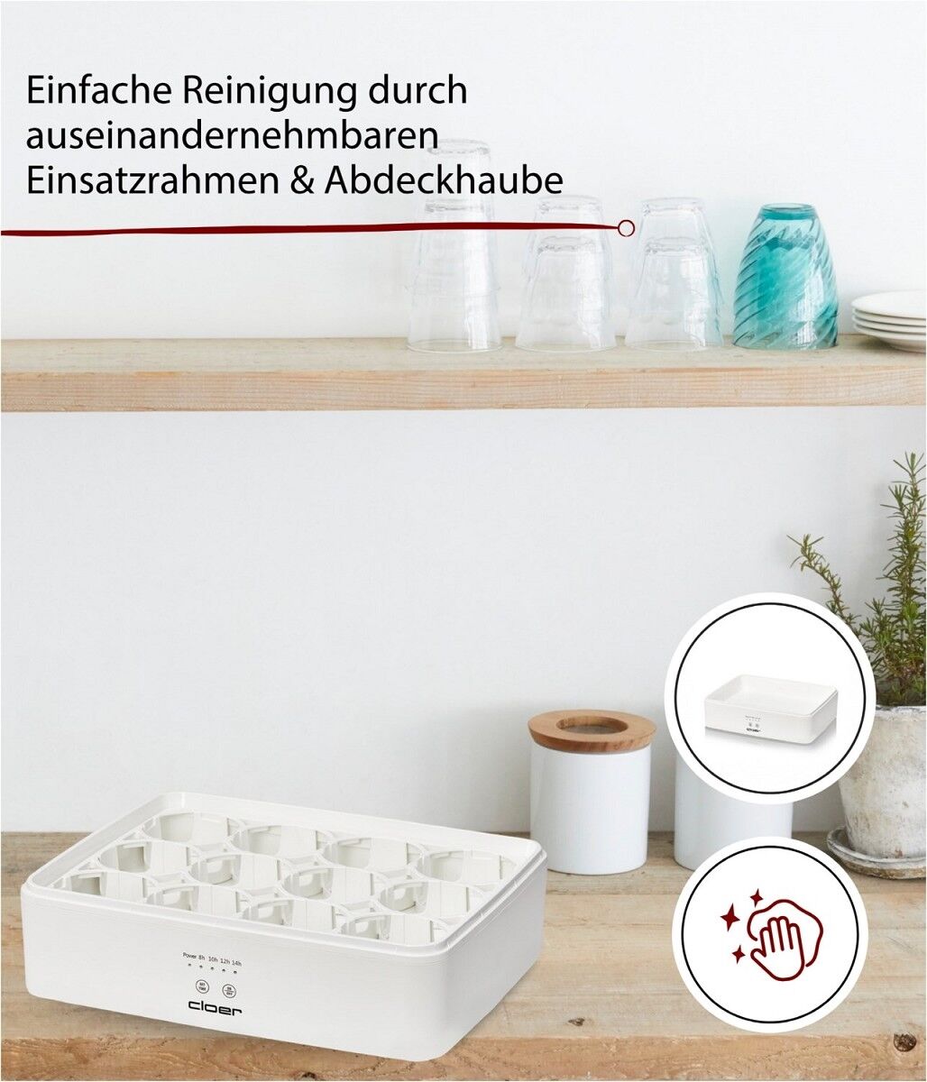 Ein Einsatzrahmen sorgt für stabilen Halt der Gläser, während die transparente Abdeckhaube den Gärvorgang sichtbar macht und die Wärme gleichmäßig verteilt.