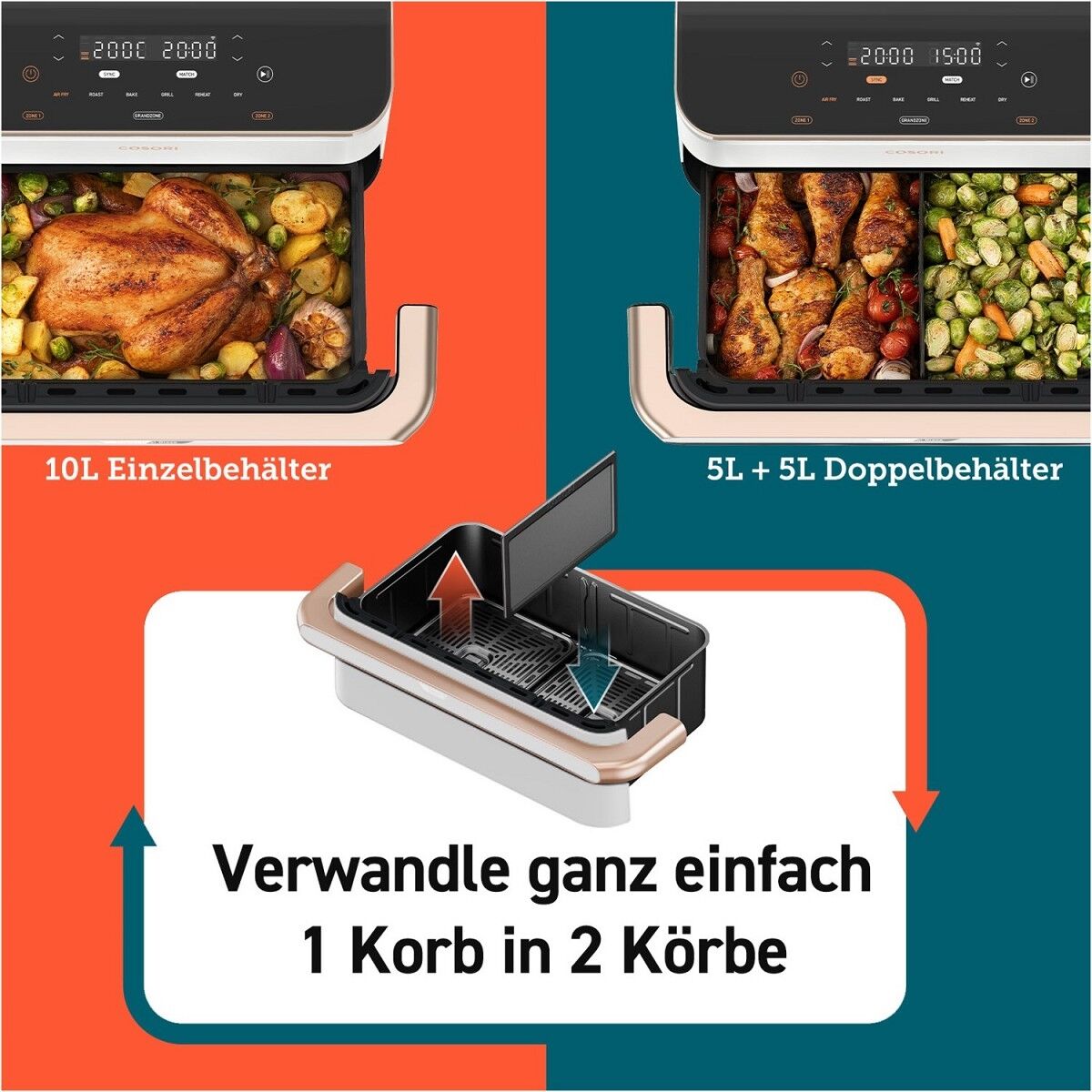 Diese Heißluftfritteuse lässt keine Wünsche offen und erweitert Ihr Koch-Repertoire: Machen Sie ganz einfach aus einem einzelnen Korb zwei getrennt von einander steuerbare.