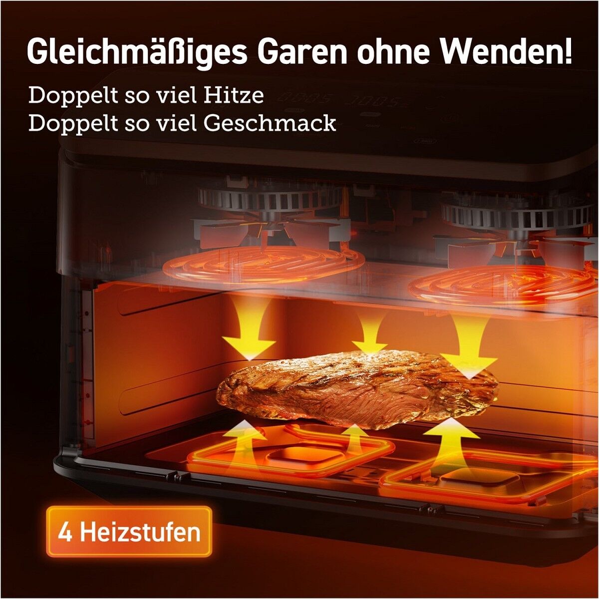 Für die knusprigsten und schmackhaftesten Ergebnisse stehen 2x 1.350 Watt Oberhitze und 2x 350 Watt Unterhitze zur Verfügung.