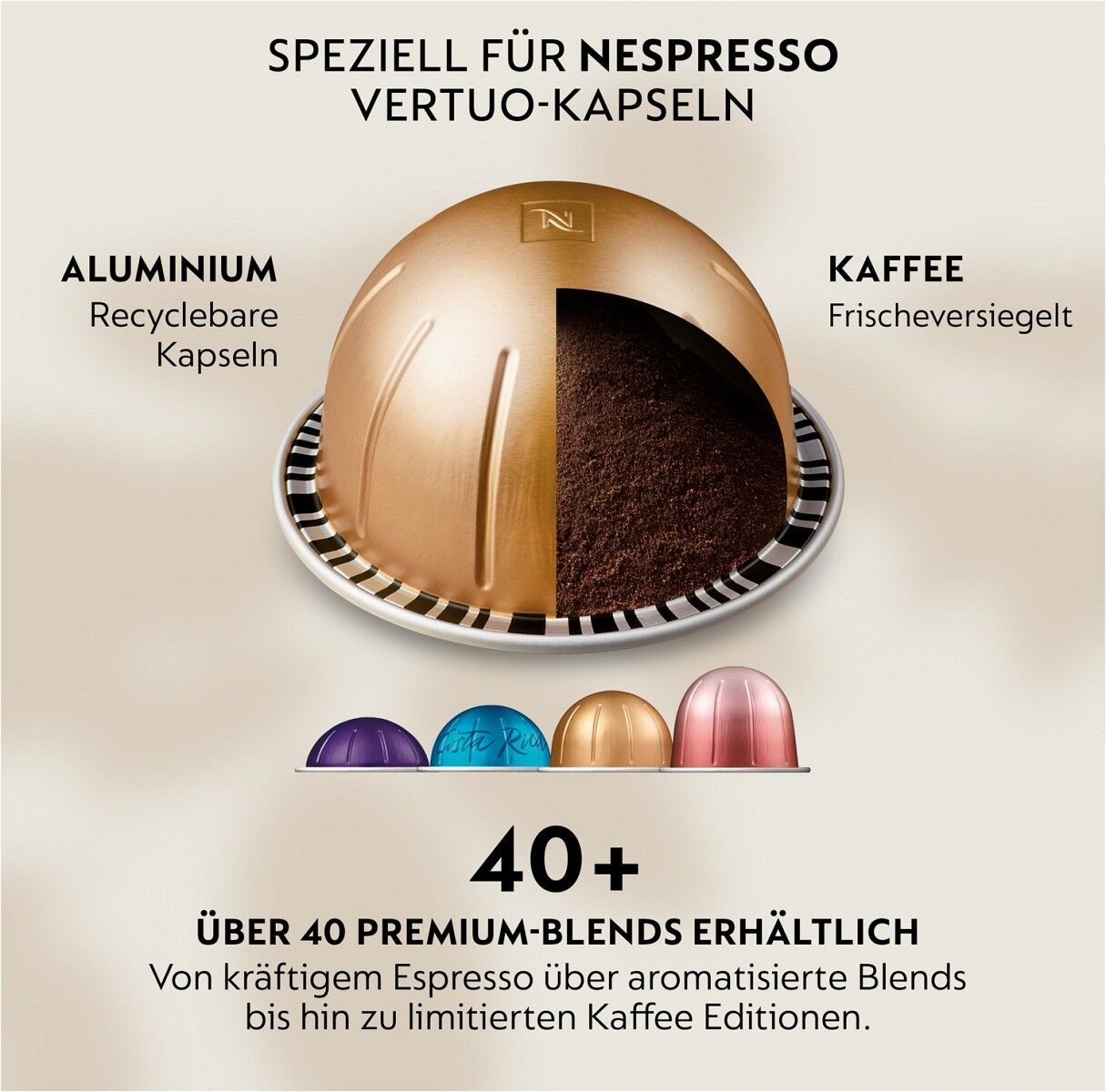 Kaffeevielfalt für zuhause: Über 40 Premium Kaffeesorten für den Genuss von fünf Tassengrößen: Espresso, Double Espresso, Gran Lungo, Mug und Carafe.