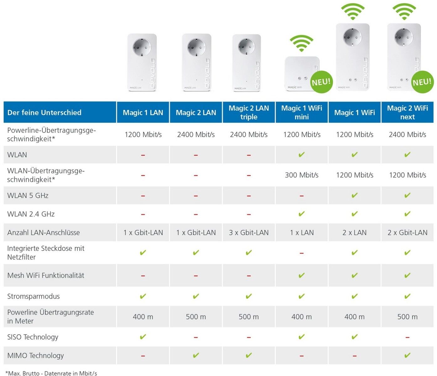 Digitalen Lifestyle in jeder Hinsicht bietet der devolo Magic 1 WiFi mini. Mit dem kompakten Adapter im Mini-Design optimieren oder erweitern Sie ganz einfach Ihr Heimnetzwerk. Das dank Mesh-Funktion und G.hn-Technologie auch zukunftssicher ist. Dabei fügt sich der Magic 1 WiFi mini unauffällig in die Umgebung ein und zeigt seine Größe nur da, wo es drauf ankommt. Die Powerline-Technologie sorgt für eine stabile Verbindung bei Geschwindigkeiten von bis zu 1200 Mbit/s, auch über weite Strecken. Für zuverlässiges Internet überall im Haus. Der Fast Ethernet Port bietet Anschluss für Smart-TV, PC oder Drucker. Machen Sie den Schritt in die Zukunft schon heute – mit dem Magic 1 WiFi mini von devolo.
