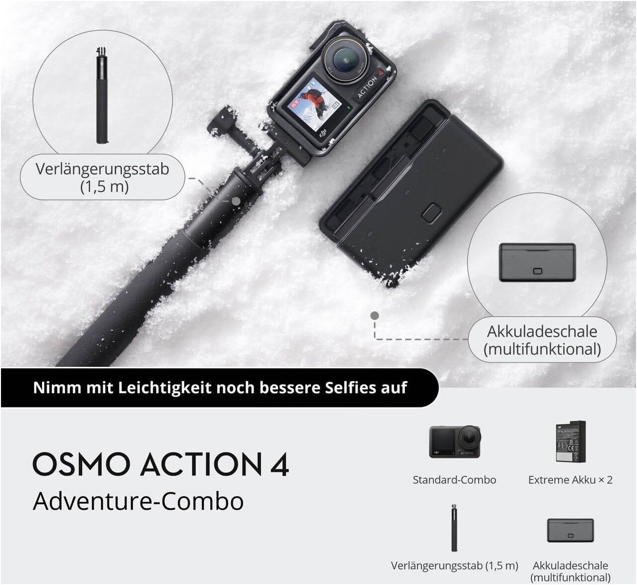 Im Vergleich zur Standard-Combo wird die Osmo Action 4 Adventure-Combo mit zwei zusätzlichen Extreme Akkus und einem Verlängerungsstab (1,5 m) geliefert, der dir ausreichend Leistung für lange dauernde Aufnahmen bietet und Mehrwinkel-Selfies beim Skifahren oder in anderen Szenarien ermöglicht.