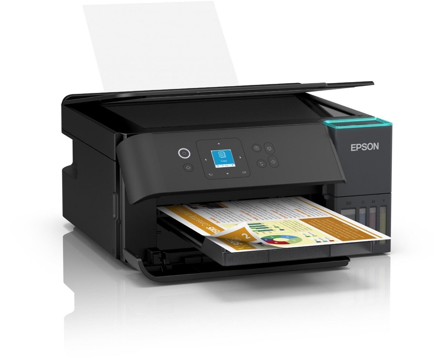 Mit einer Papierkassette für 100 Blatt Papier an der Rückseite, Unterstützung für den randlosen Fotodruck (bis zu A4) und hohen Druckgeschwindigkeiten von bis zu 15 Seiten pro Minute* können Sie problemlos und schnell verschiedene Aufgaben erledigen. Zu den weiteren Vorteilen gehören ein benutzerfreundlicher 3,7 cm großer LC-Display, ein automatischer beidseitiger Druck, eine schnelle und einfache Anpassung der Druckqualität und ein praktisches Ausgabefach, das sich beim Drucken automatisch öffnet. Dank des stilvollen blauen Lichts auf der Oberseite des Tintentankdeckels können Sie den Status Ihres Druckers auf einen Blick überwachen.