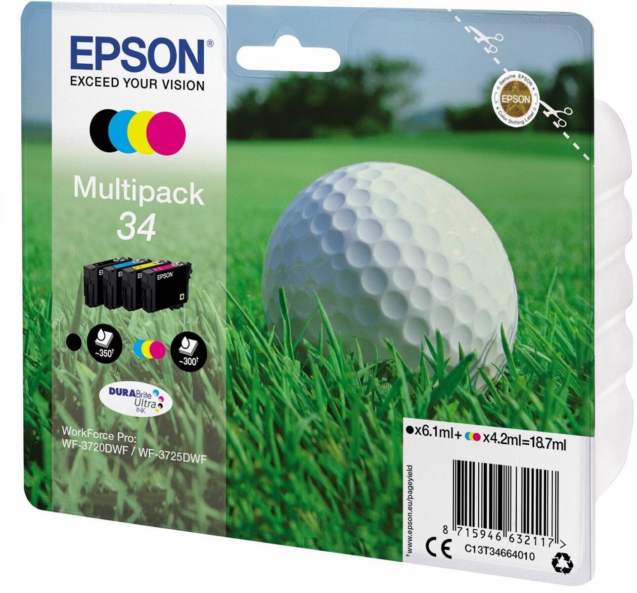 Epson Golf ball Multipack 4-colours 34 DURABrite Ultra Ink. Tintenpatronenkapazität: Standardertrag, Schwarzer Tintentyp: Tinte auf Pigmentbasis, Volumen schwarze Tinte: 6,1 ml, Versorgungstyp: Multipack, Volumen Farbtinte: 4,2 ml, Menge pro Packung: 1 Stück(e)