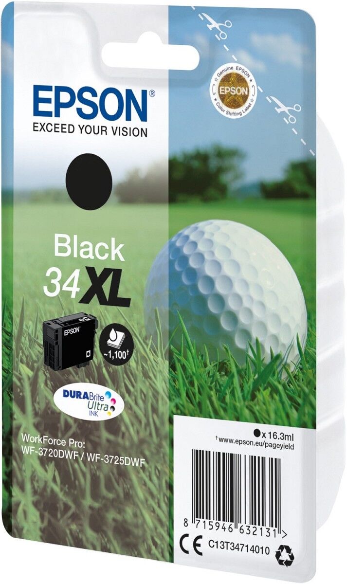 Epson Golf ball Singlepack Black 34XL DURABrite Ultra Ink. Tintenpatronenkapazität: Hohe (XL-) Ausbeute, Schwarzer Tintentyp: Tinte auf Pigmentbasis, Volumen schwarze Tinte: 16,3 ml, Menge pro Packung: 1 Stück(e), Seitenergebnis schwarze Tinte: 1100 Seiten