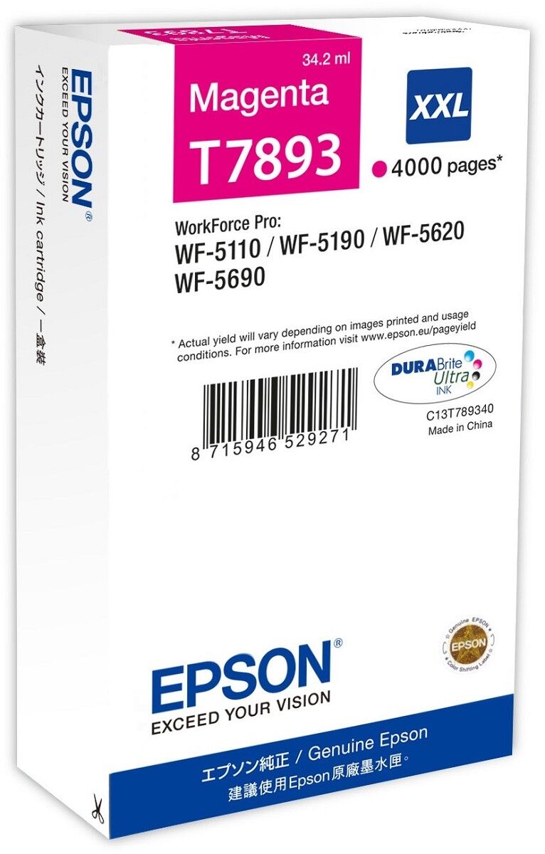 Epson Tintenpatrone XXL Magenta 4k. Tintenpatronenkapazität: Extrahohe (Super-) Ausbeute, Colour ink type: Tinte auf Pigmentbasis, Menge pro Packung: 1 Stück(e)