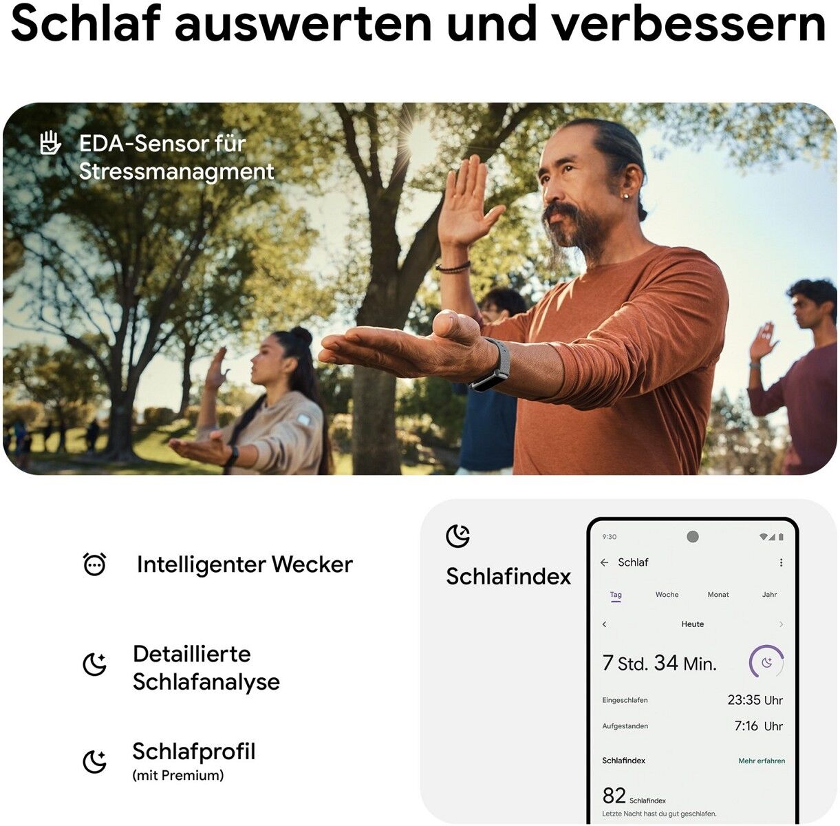 Mit der EKG-Funktion und Herzfrequenz-Warnungen kannst du auf dein Herz achten. Dank Schlafindex und EDA-Scans gewinnst du neue Einblicke in deinen Schlaf und Stress. Und mit Fitbit Premium werden dir immer für deine Tagesform passende Aktivitäten vorgeschlagen.