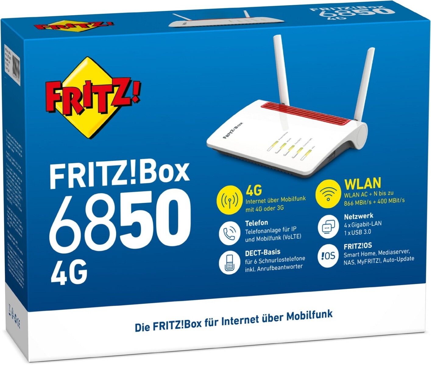 Die FRITZ!Box 6850 4G bietet schnellen Internetzugang über 4G/LTE mit Datenraten von bis zu 300 MBit/s und stellt gleichzeitig WLAN AC + N im Dualband. Als vielseitige Zentrale im Heim- oder Büronetz verbindet sie zuverlässig zahlreiche Geräte wie Computer, Smartphones, Tablets, TVs oder Drucker. Die FRITZ!Box 6850 4G überzeugt zudem mit komfortabler Telefonie, intelligenten Sicherheitsfunktionen und umfangreichen Smart-Home-Funktionen via DECT ULE sowie einem leistungsstarken FRITZ!OS.