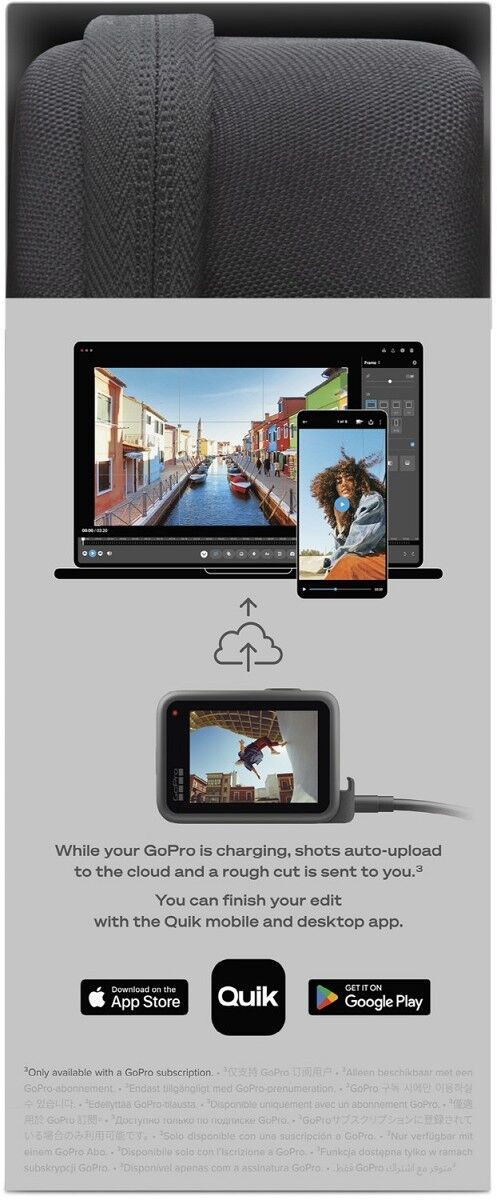 ⁵ Innerhalb deines WLAN-Heimnetzwerks. GoPro Abo erforderlich. Das GoPro Abo ist in ausgewählten Gebieten verfügbar. Jederzeit kündbar. Weitere Informationen und Verfügbarkeit auf gopro.com. Cloud-Upload und automatische Highlight-Videos sind in China nicht verfügbar.
