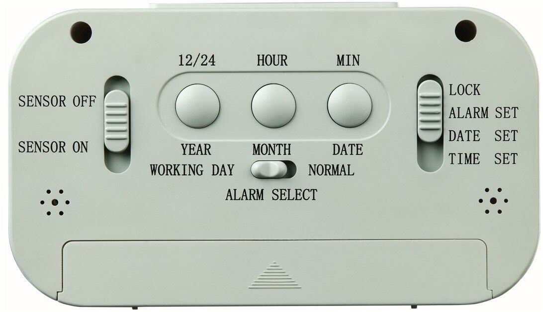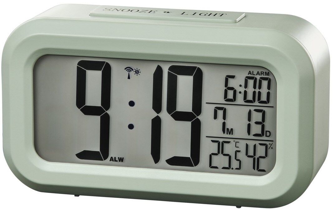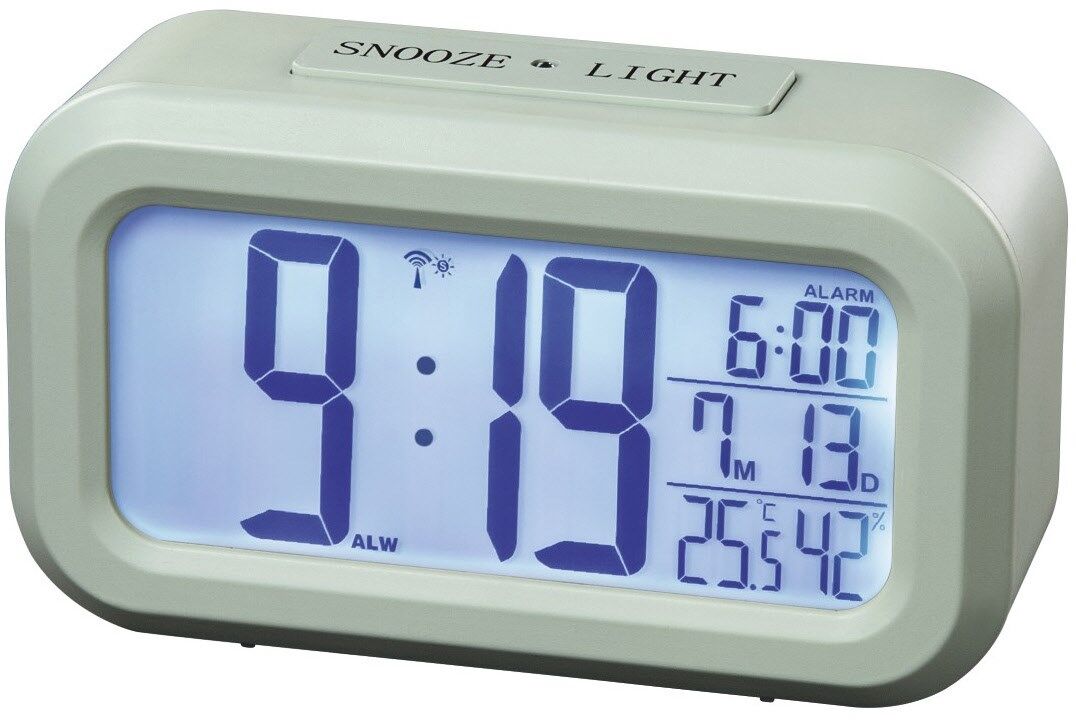 DCF-Funkuhr mit digitaler Anzeige von Uhrzeit, Weckzeit, Datum, Temperatur und Luftfeuchtigkeit