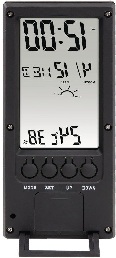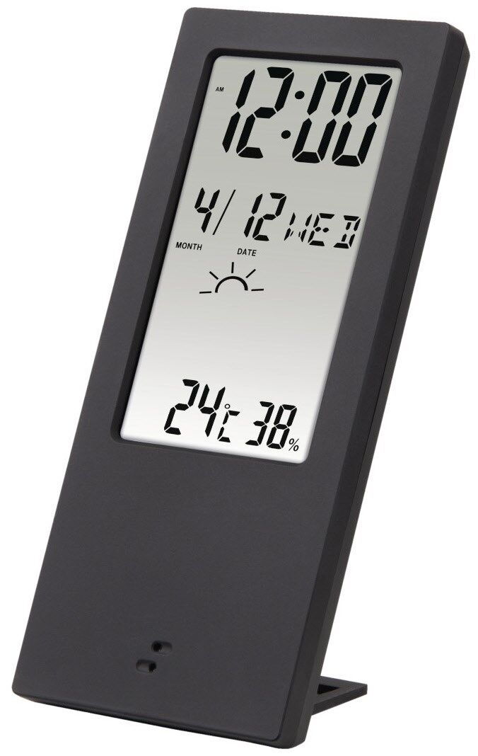 digitale transparente Displayanzeige von Temperatur, Luftfeuchtigkeit, Uhrzeit und aktueller Wetterlage