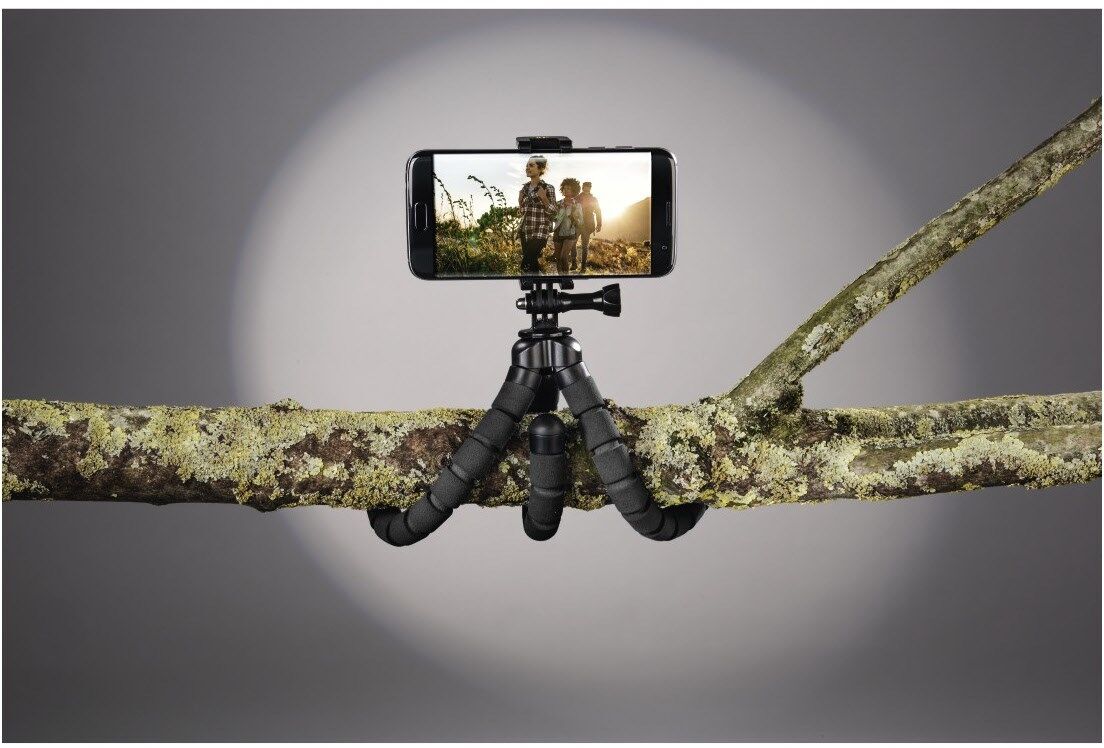 Smartphone-Halterung abnehmbar und für andere Stative verwendbar. Anschluss von Kameras mit GoPro-Anschluss