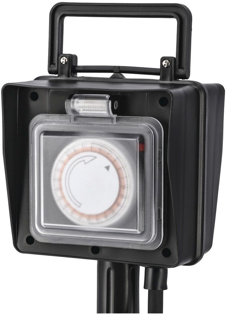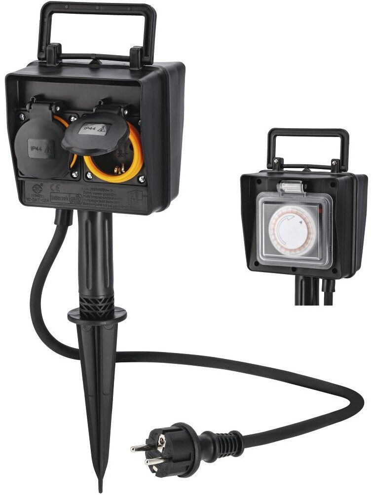 Gartensteckdose mit Zeitschaltuhr zum Anschluss von bis zu zwei elektrischen Geräten für eine stromsparende Nutzung im Außenbereich