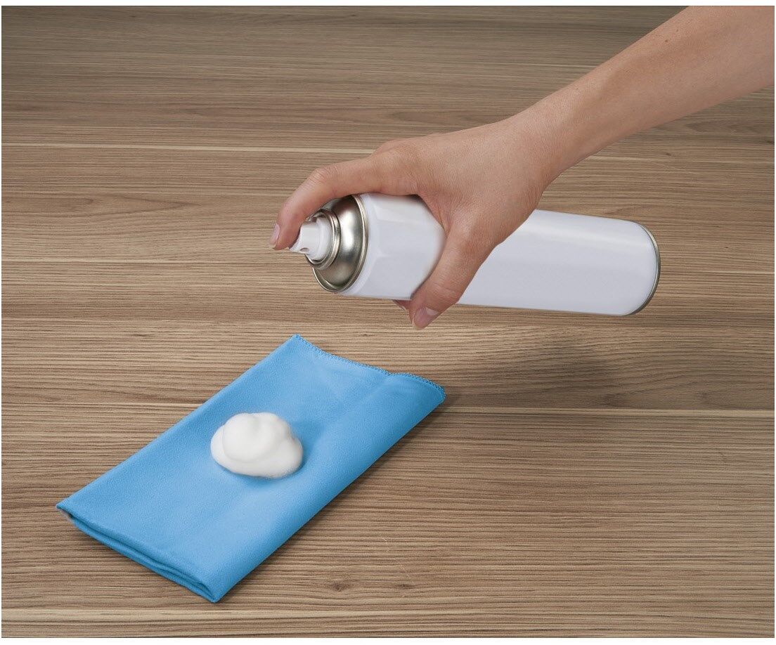 Bildschirm-Reinigung leicht gemacht: TV-Reinigungsschaum auf das Bildschirm-Reinigungstuch auftragen, verreiben und mit trockenem Tuch abwischen – fertig
