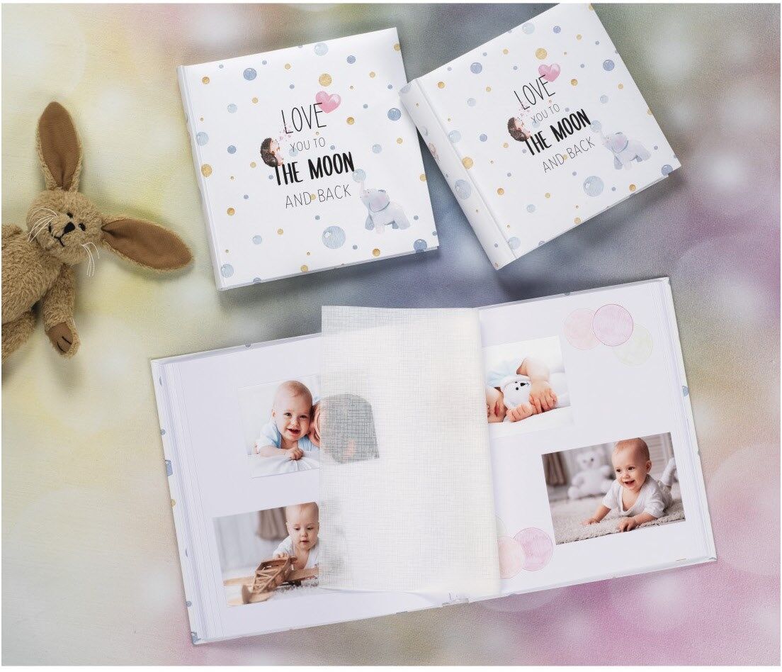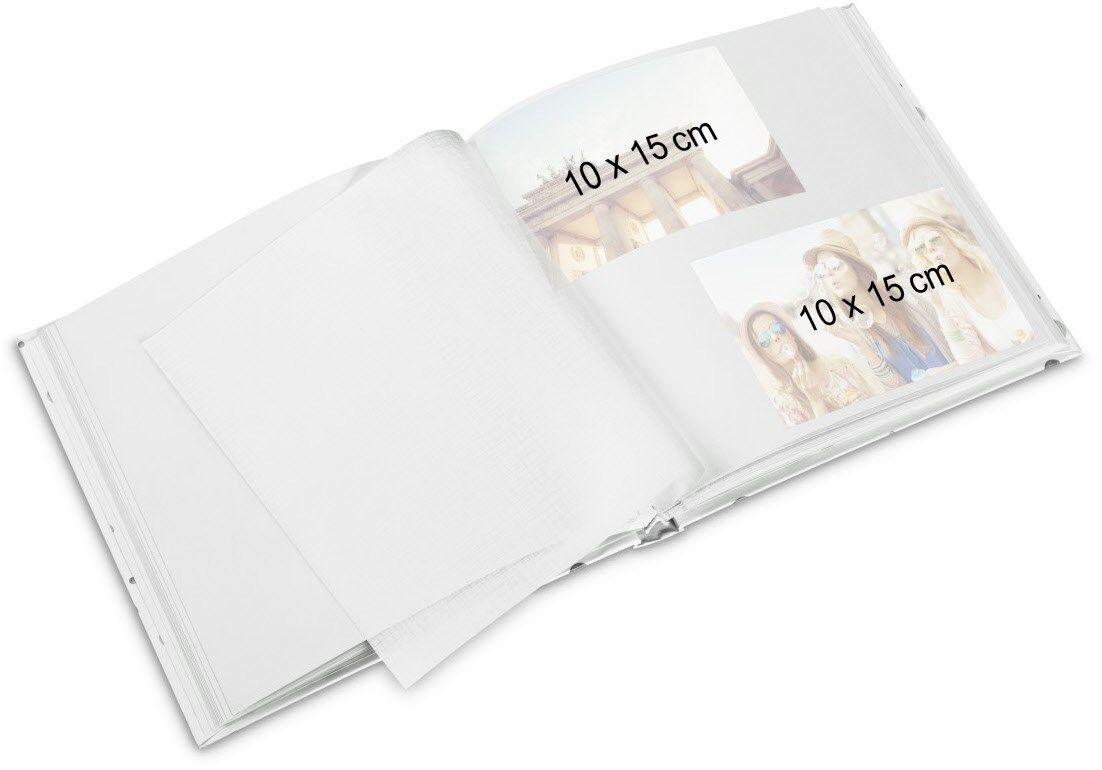 Die Innenseiten sind voneinander durch weiß-transparente Pergaminschutzseiten getrennt: Das erlaubt den Überblick auf die folgende Seite und schützt Ihre Fotos und kreativ gestalteten Seiten vor Aneinanderhaften
