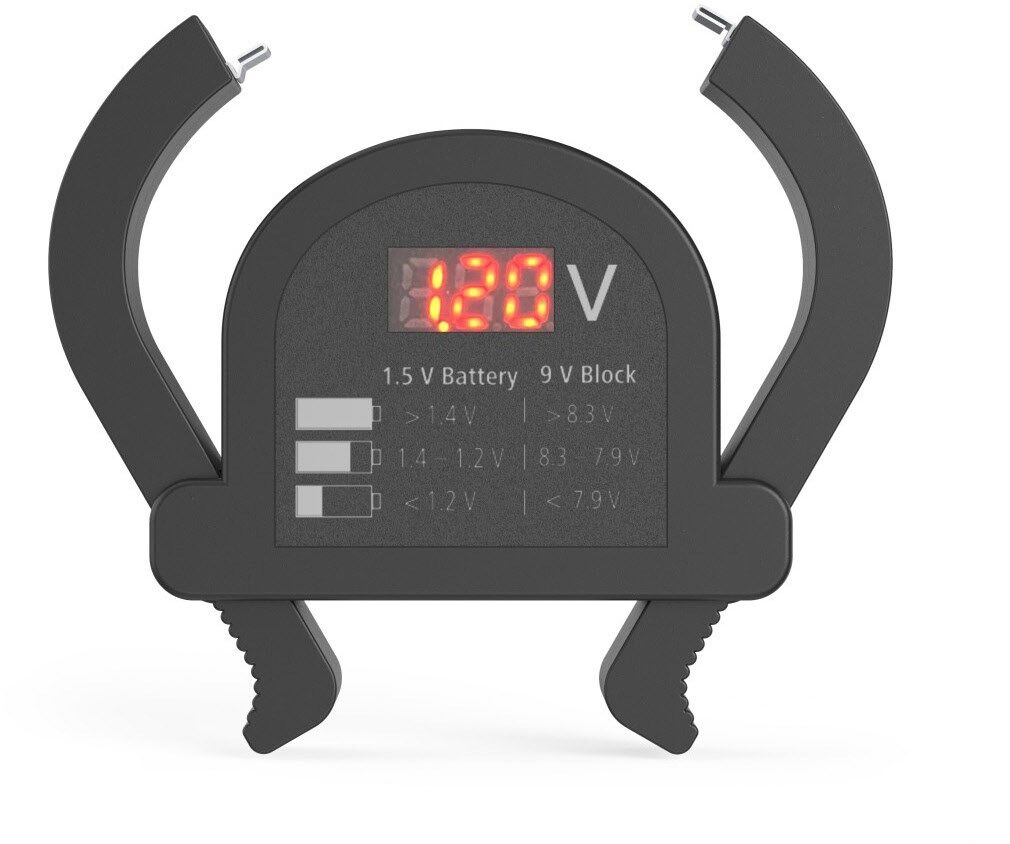 6 verschiedene Akku-/Batterietypen messbar: AA Mignon, AAA Micro, C Baby, D Mono, 9 V-Block, Knopfzellen