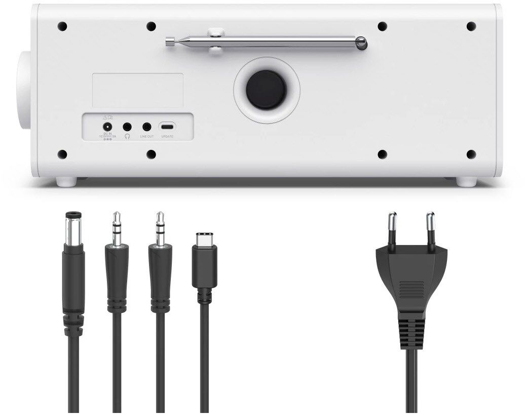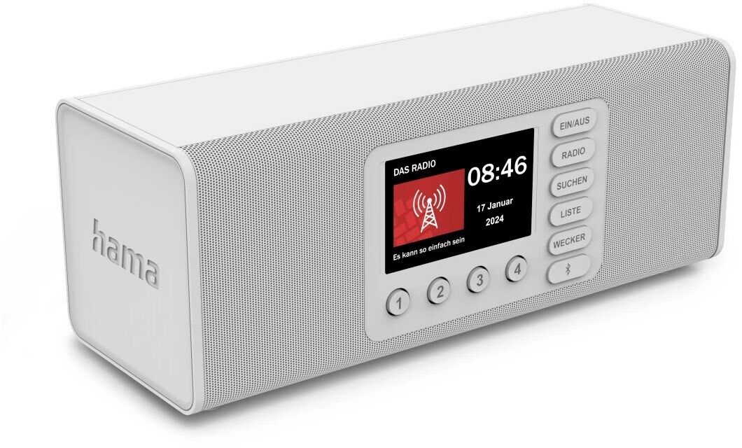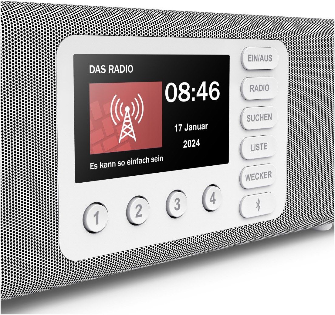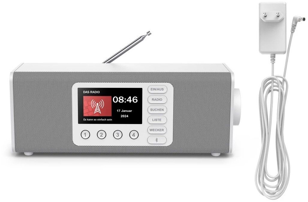 FM/DAB/DAB+. Rauschfreier Hörgenuss im umfangreichen DAB+-Senderangebot. Mehrere Sender landesweit empfangbar und eine Vielzahl von regionalen Radiostationen in digitaler Qualität. Technische Informationen. Ausgewogener Stereo-Klang über zwei Lautsprecher (2 x 5W). Ausziehbare Teleskopantenne. Automatische Uhrzeitabgleichung über das Radionetz. 4,3“-Display (Farb-TFT). Konnektivität. Bluetooth. Anschluss. 3,5-mm-Klinkenkupplung. Sonstiges:. Radiowecker: Auswahl zwischen Weckton und Radiosender. 2 Alarm-Speicherplätze. Kurzwahlfunktion zum Einschalten und Ausschalten des Weckers.