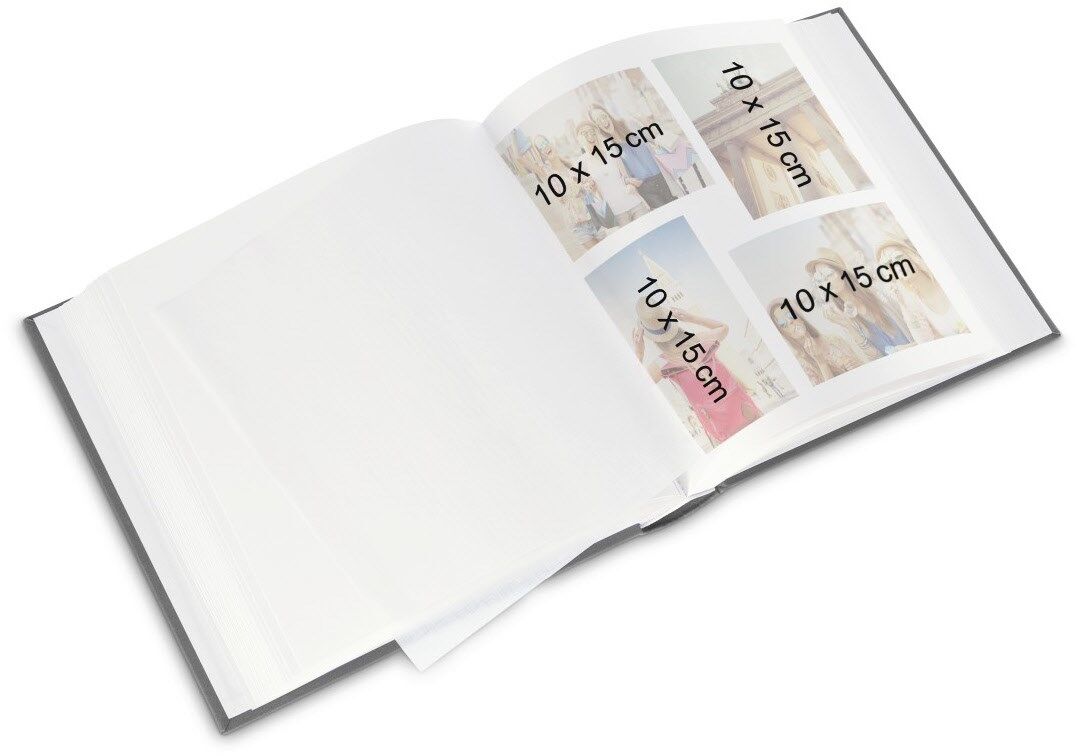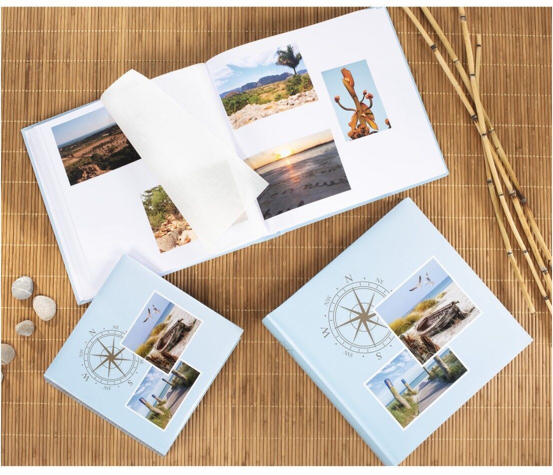 Die Innenseiten sind voneinander durch weiß-transparente Pergaminschutzseiten getrennt: Das erlaubt den Überblick auf die folgende Seite und schützt Ihre Fotos und kreativ gestalteten Seiten vor Aneinanderhaften