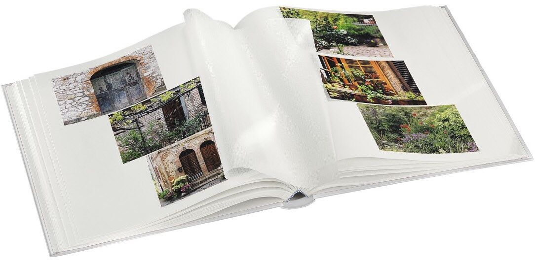 Die Innenseiten sind voneinander durch weiß-transparente Pergaminschutzseiten getrennt: Das erlaubt den Überblick auf die folgende Seite und schützt Ihre Fotos und kreativ gestalteten Seiten vor Aneinanderhaften