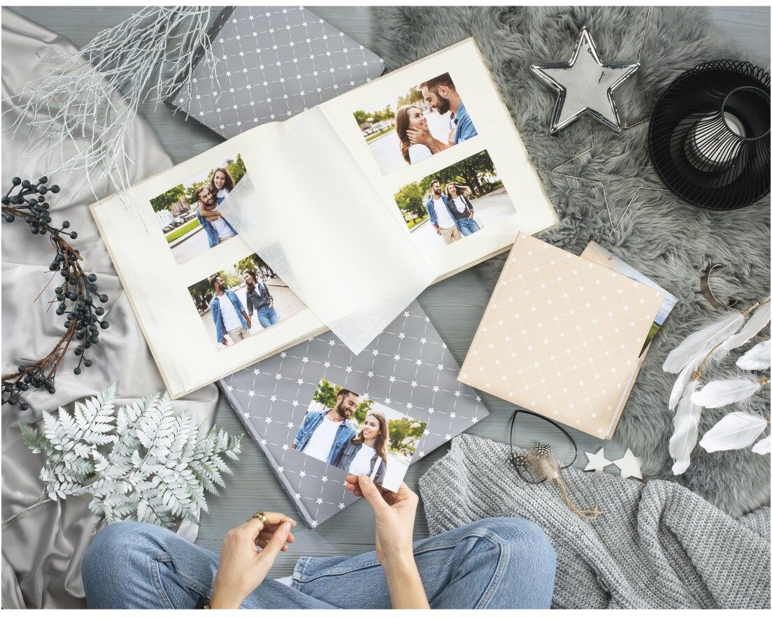 Die Innenseiten sind voneinander durch weiß-transparente Pergaminschutzseiten getrennt: Das erlaubt den Überblick auf die folgende Seite und schützt Ihre Fotos und kreativ gestalteten Seiten vor Aneinanderhaften