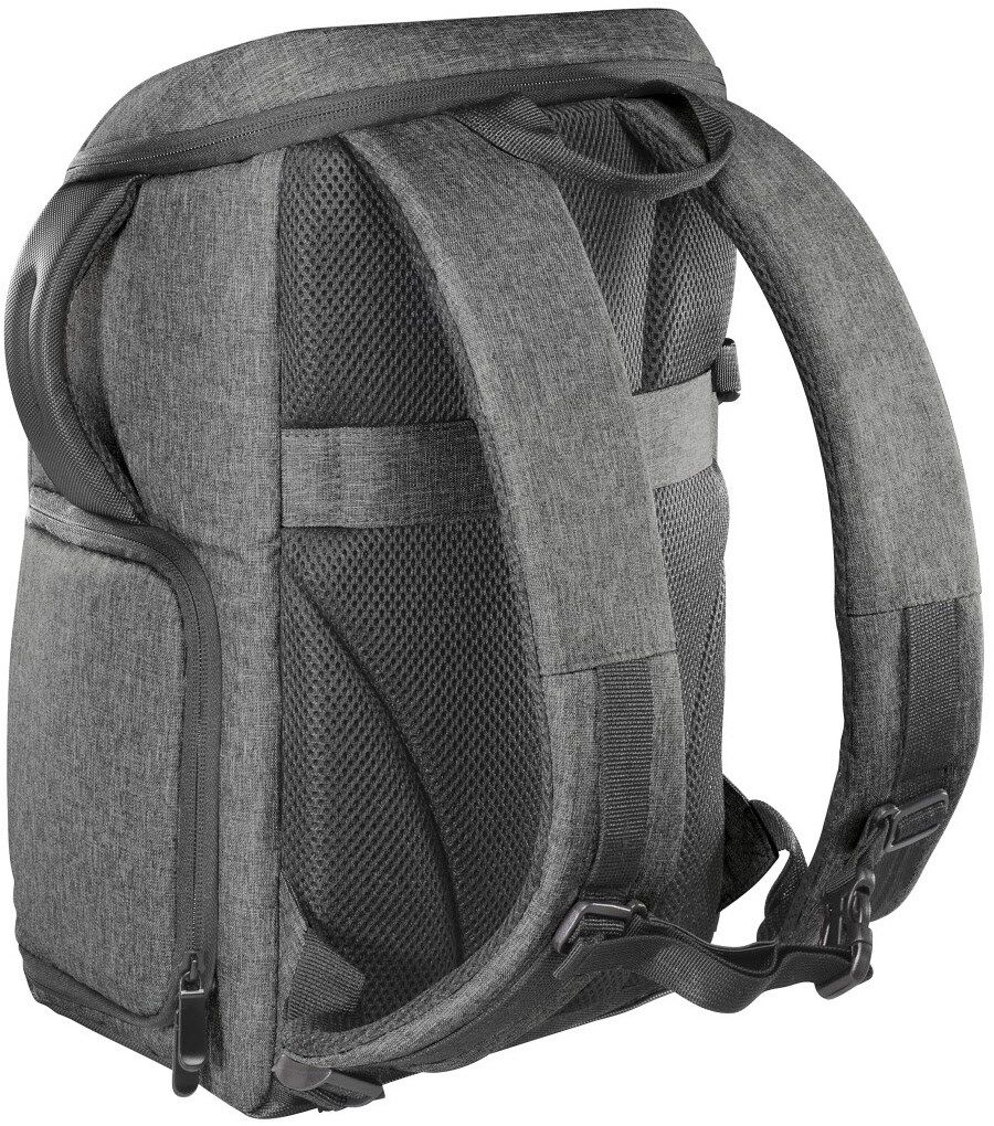 Aus Netzmaterial ergonomisch gepolstertes Rückenteil, verstellbarer Brustgurt, extra Tragegriff auf der Rückseite oben, zusätzlicher Tragegriff seitlich, unter dem Deckel innen zwei Fächer für Zubehör wie Batterien und SD Cards