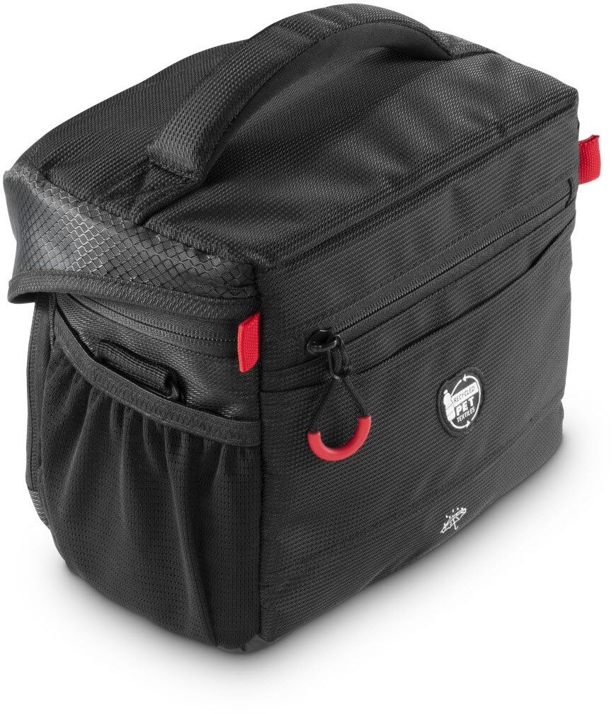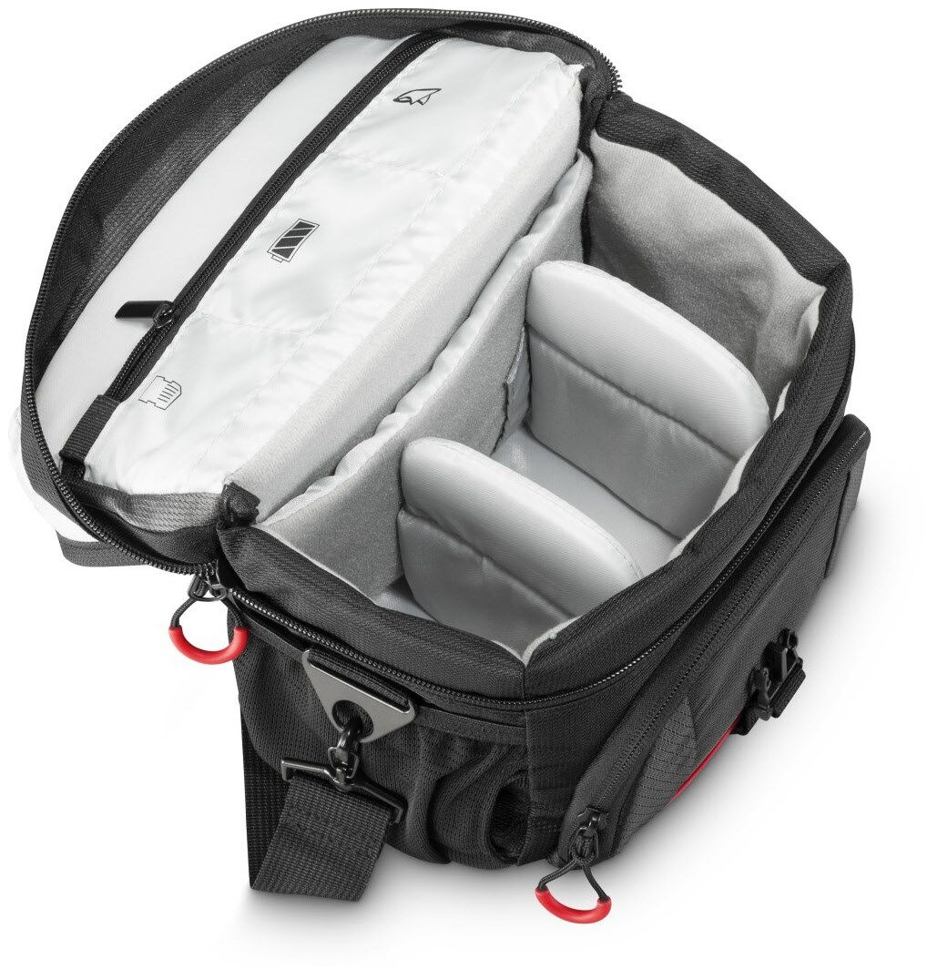 Reißverschlussfach auf dem Deckel, zusätzliches Reißverschlussfach unter dem Deckel für z.B. Speicherkarten, Reißverschlussfach an der Taschenrückseite außen