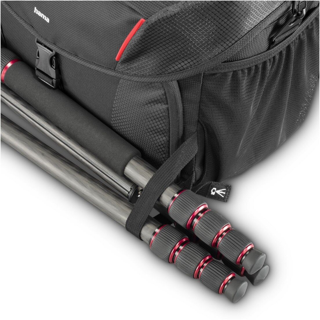 2 Netztaschen an den Seiten außen, flexibel verstellbare Stativhalterungen unter den seitlichen Netztaschen, 7 variable Inneneinteiler